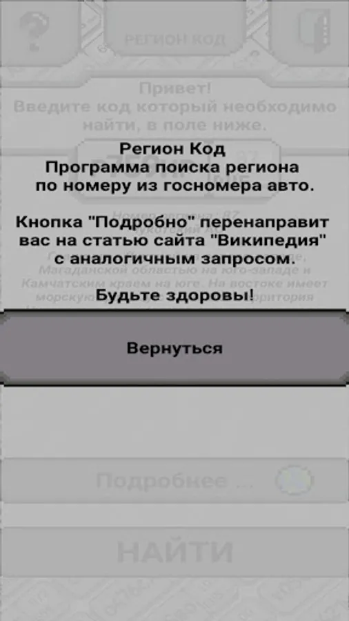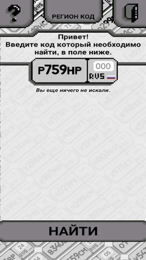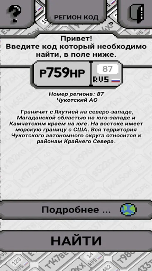 The program allows you to quickly and without much difficulty find the region by the registration number of the car with a nice design in the form of Pixel art and animation in the background. Only 3 clicks and you will find all the information you need about any region in the Russian Federation !! Enjoy your use and do not get sick!