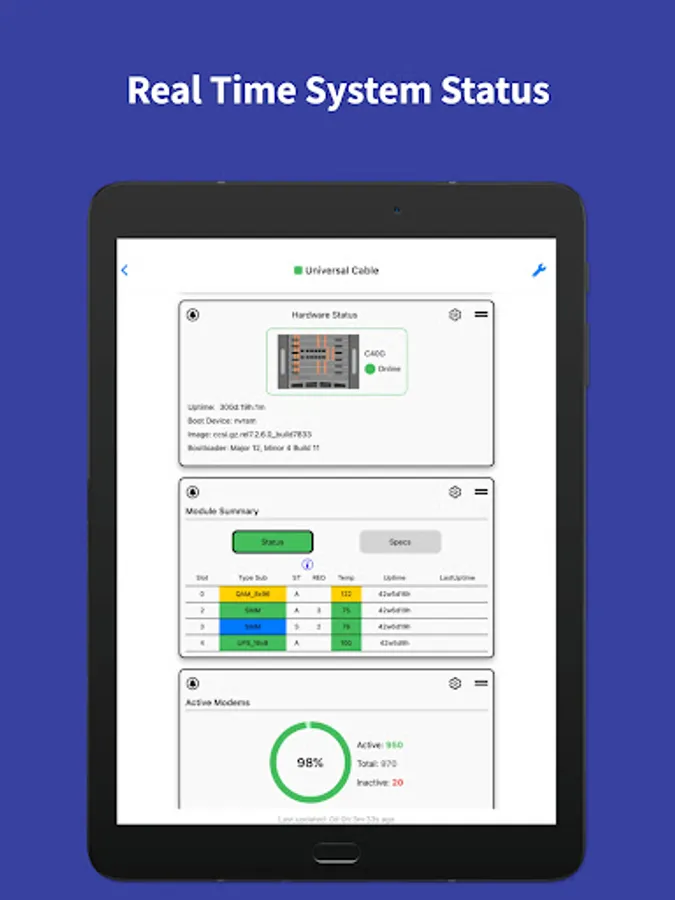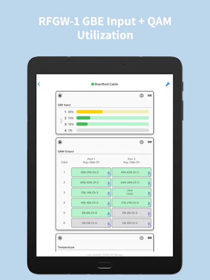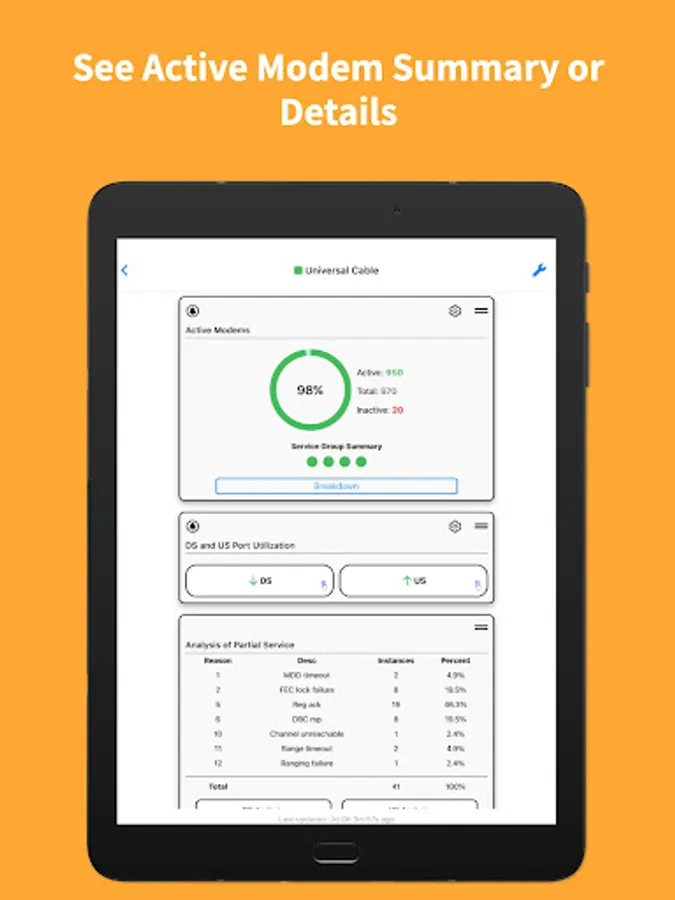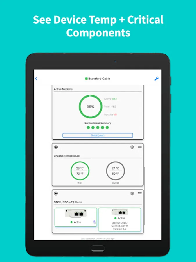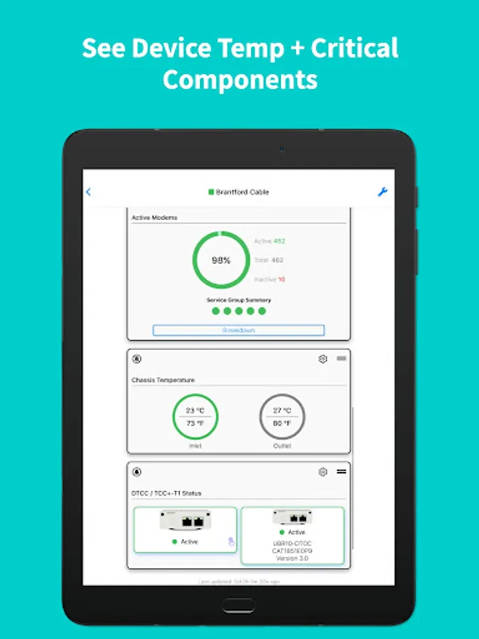 TelaWatch monitors 24/7 for cable modem outages; upstream signal quality; temperature changes; upstream / downstream utilization; partial service bonding problems; component failures (such as the DTCC and QAM cards); fan status as well as uptime and connectivity. It also allows for instant remote viewing of all devices installed as well as a rolling log of all alarms issued. Alarms will be sent to the mobile device when any user-definable thresholds are met.