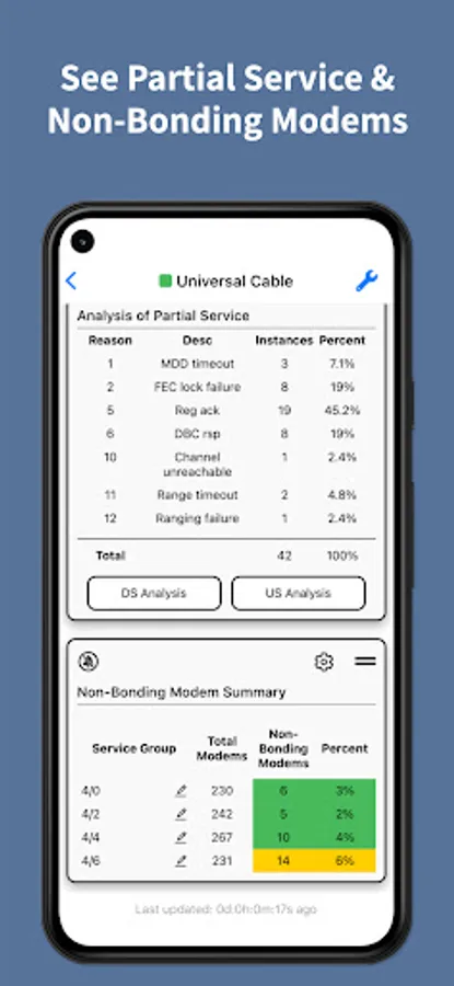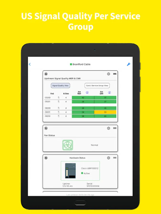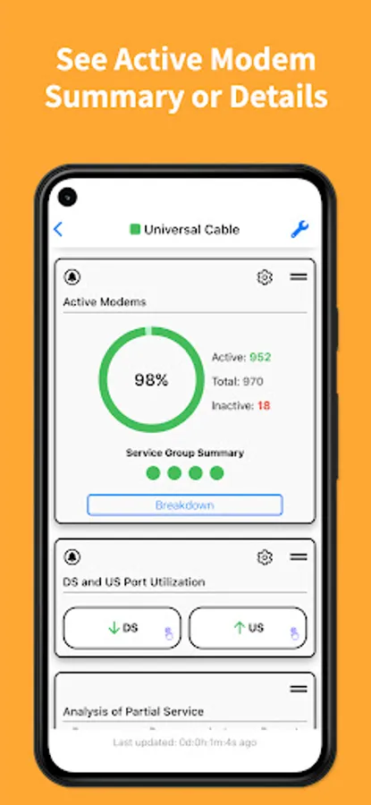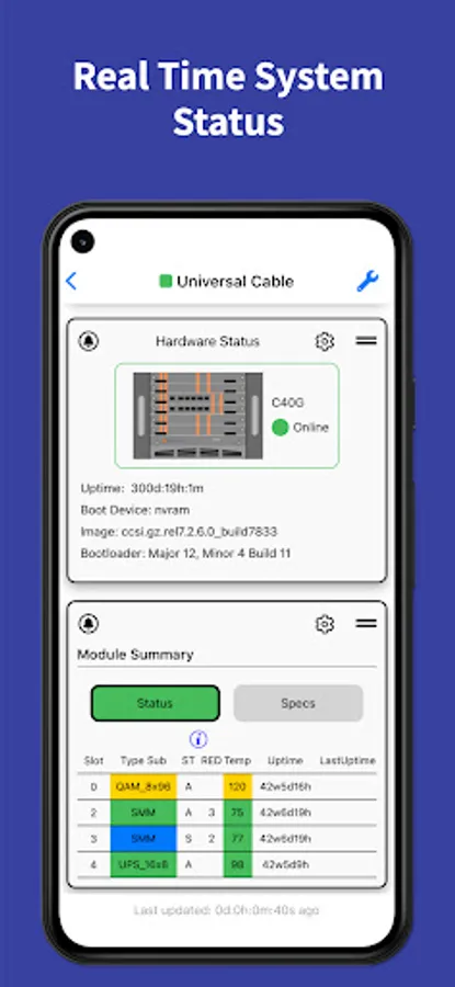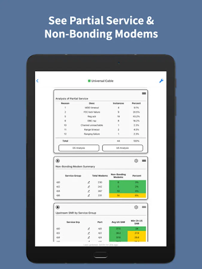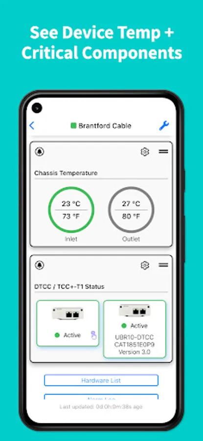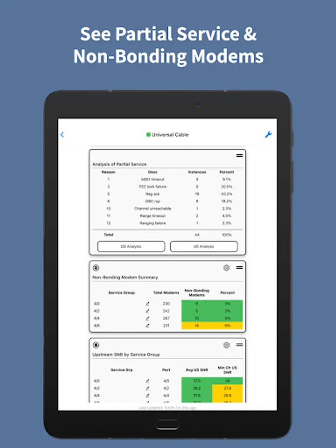 TelaWatch monitors 24/7 for cable modem outages; upstream signal quality; temperature changes; upstream / downstream utilization; partial service bonding problems; component failures (such as the DTCC and QAM cards); fan status as well as uptime and connectivity. It also allows for instant remote viewing of all devices installed as well as a rolling log of all alarms issued. Alarms will be sent to the mobile device when any user-definable thresholds are met.