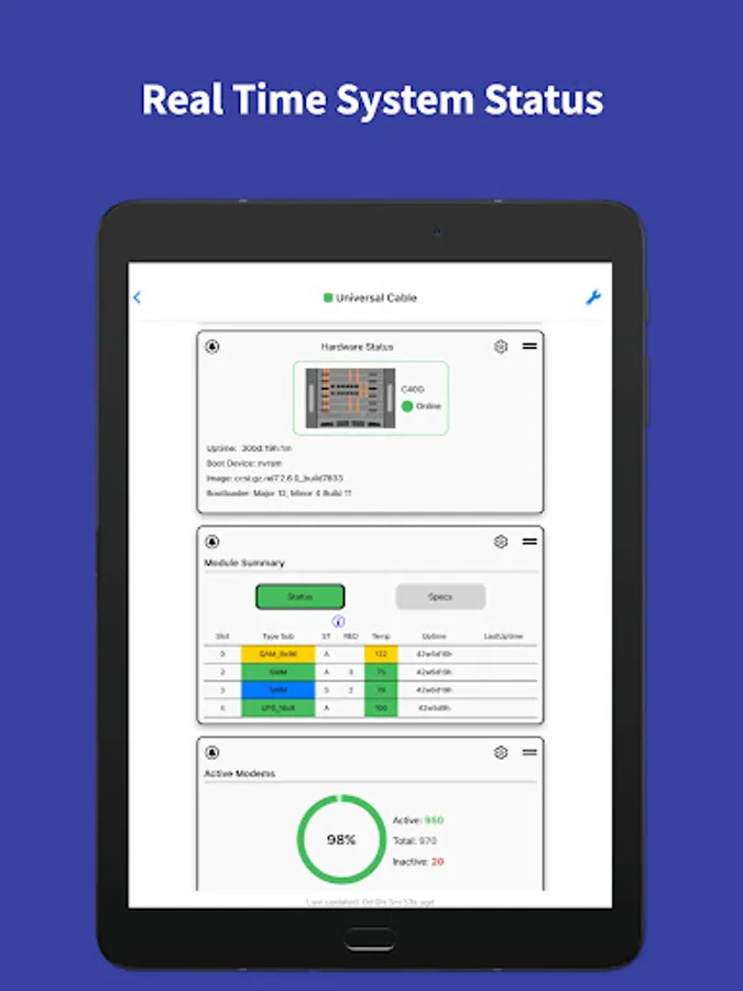 TelaWatch is a cutting-edge application that provides real-time information and monitors internet networks which use DOCSIS, GPON / Fiber, Switched or Enhanced Ethernet, WAN Routers and/or DSL / VDSL equipment. Currently qualified devices include the Cisco uBR7246VXR / uBR10012 / RFGW-1 / Time Creator 1000; CASA C40G / C100G plus Mikrotik Routers. Additional device support is being added on a regular basis.