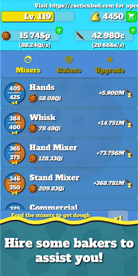 - Spend your cookies to feed and purchase mixers as they will produce dough for you.