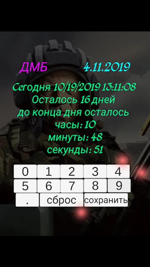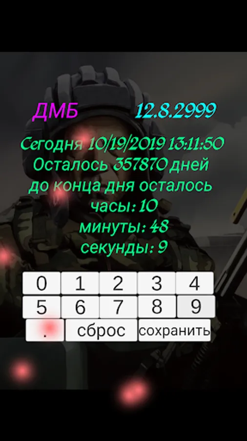 The DMB Timer application will show how much time is left before the coveted demobilization. An indispensable application for military personnel, their relatives, friends and girls! :)