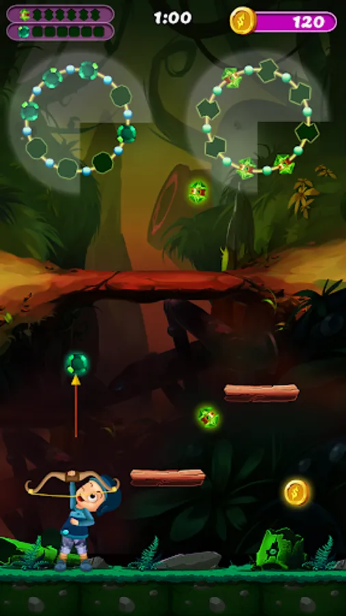 Each level has two empty rotating rings in either of the top corners of the game level. Each rings accepts a different kind of diamonds. The objective of the player is to shoot the diamonds with bow and arrow into the empty slots of the corresponding chain. The next diamond to be shot is shown under the right side chain. If both the chains are completed the level finishes.