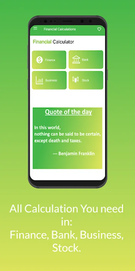 This Financial Calculator contains 4 types of calculation: Finance, Bank, Business, and Stock.