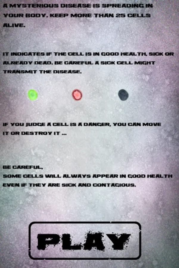 Keep 25 cells alives. You can choose to destroy or isolate sick cells. But be fast sick cell contamine others!
