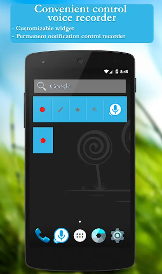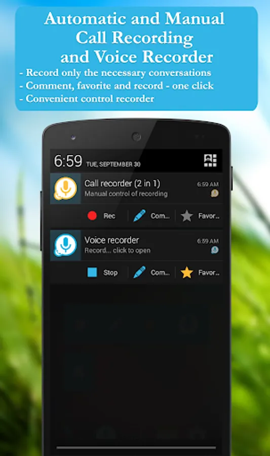 • Constant reminding in the notification panel (Record / stop, Add comment, Add to favorites) - quick access to the recorder (VERY EASY!)
