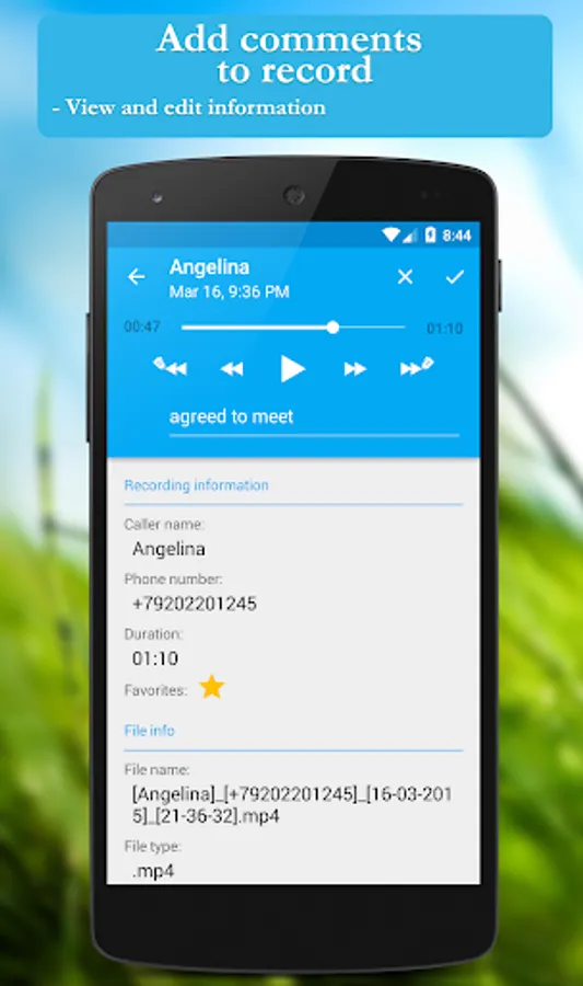 • Notification mode while recording: "Don't show the icon" - no notifications, "Show while recording" - notification appears only while recording conversation, "Show during the call" - notification appears after the call starts (Gives the opportunity to: start / stop recording manually, add a comment, add to favorites. VERY EASY!)
