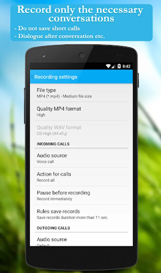 • Separate settings for incoming and outgoing calls (Record all, Don't record, Record only contacts, Record all except contacts)