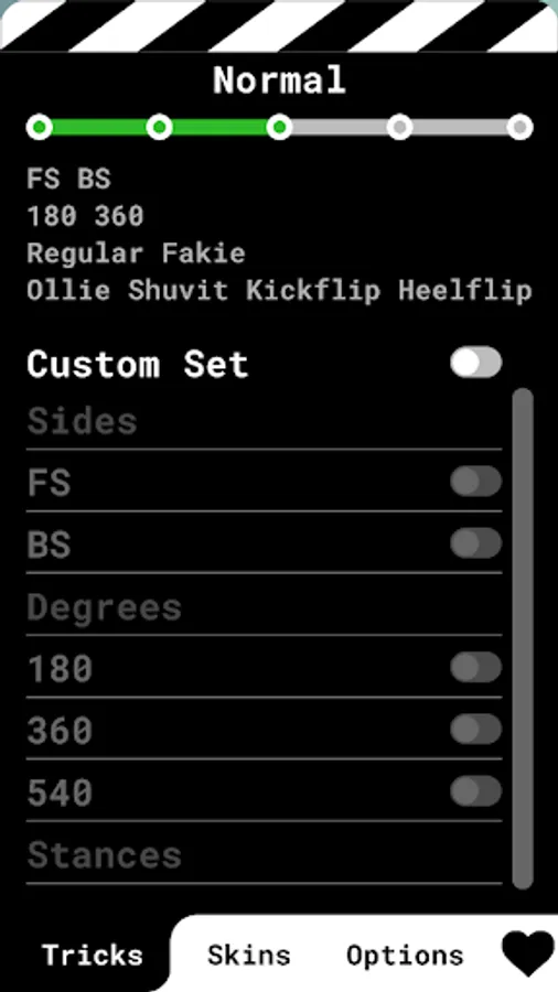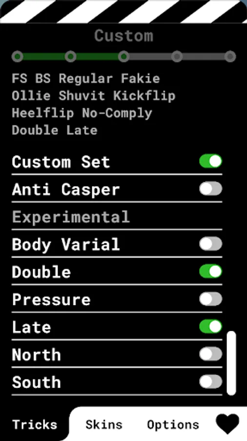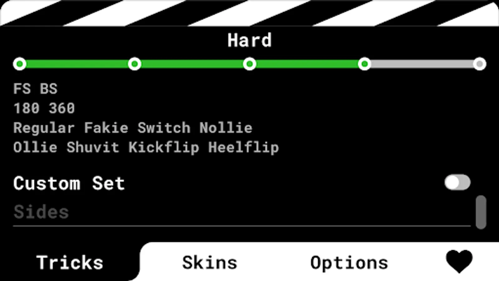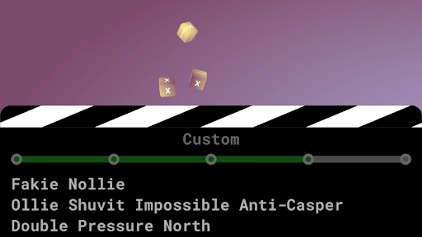 You can create your own dice set! Choose from a variaty of tricks - from Kickflip and Shuvit to Impossible and Pressure Flips.