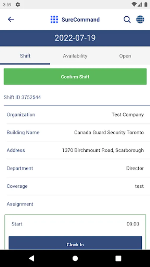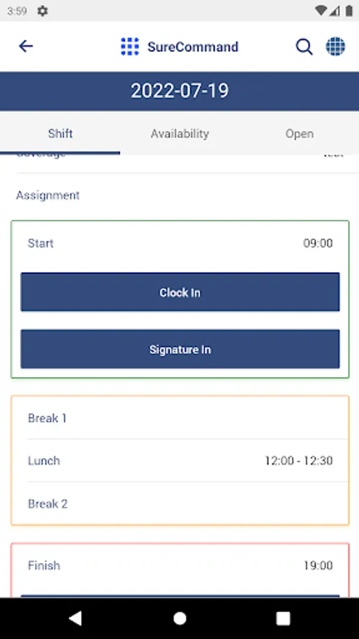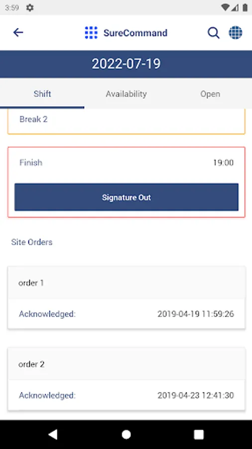 The SureCommand Mobile Application System is designed to manage workplace activities. The Surecommand System helps to coordinate, communicate and organize a Security Guards' and Private Investigators' workday by offering a feature-rich and secure access to a cloud database. These features include a digital evidence notebook, situational awareness information feeds, available local police alert, schedule, and priorities organizer, available shifts dashboard, incident manager, privacy settings, training portal, profile creation and search.