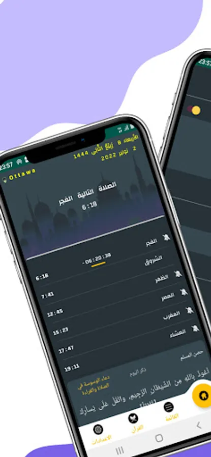 The application of prayer times in Canada alerts you when entering the time of the call to prayer in a beautiful way and a moving screen, with the ability to choose the sound of the call to prayer for each prayer separately.