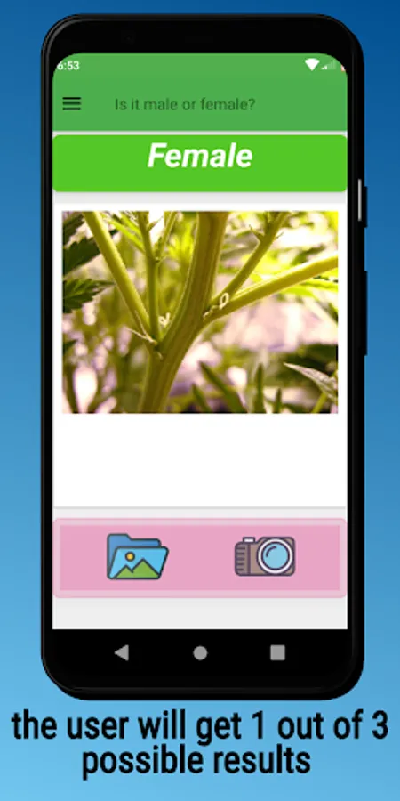 With the phone's camera and Artificial Intelligence(A.I), the user will get 1 out of 3 possible results as accurately as possible, "Female", "Male" or "Is this cannabis?".