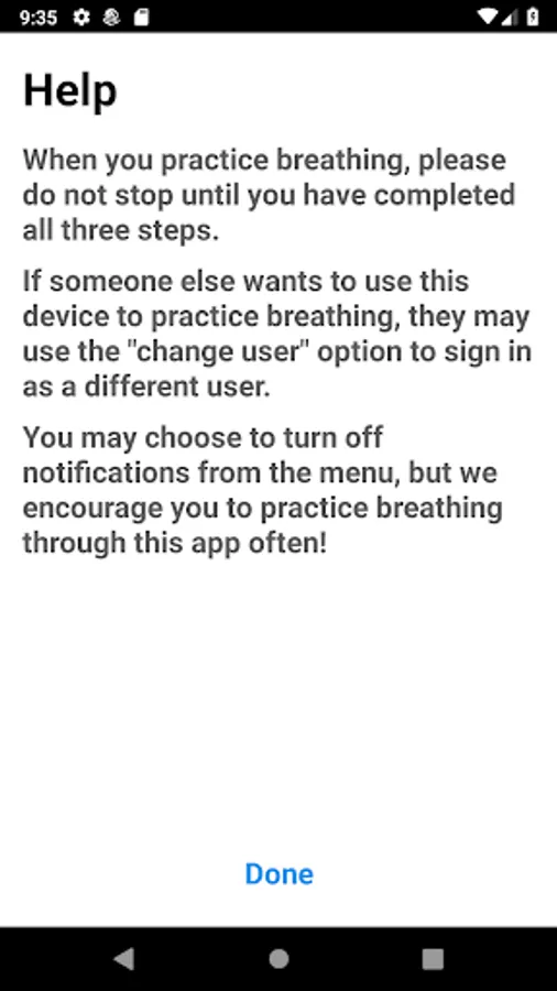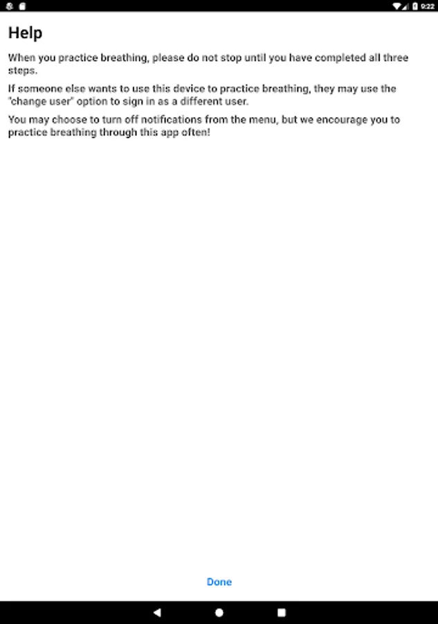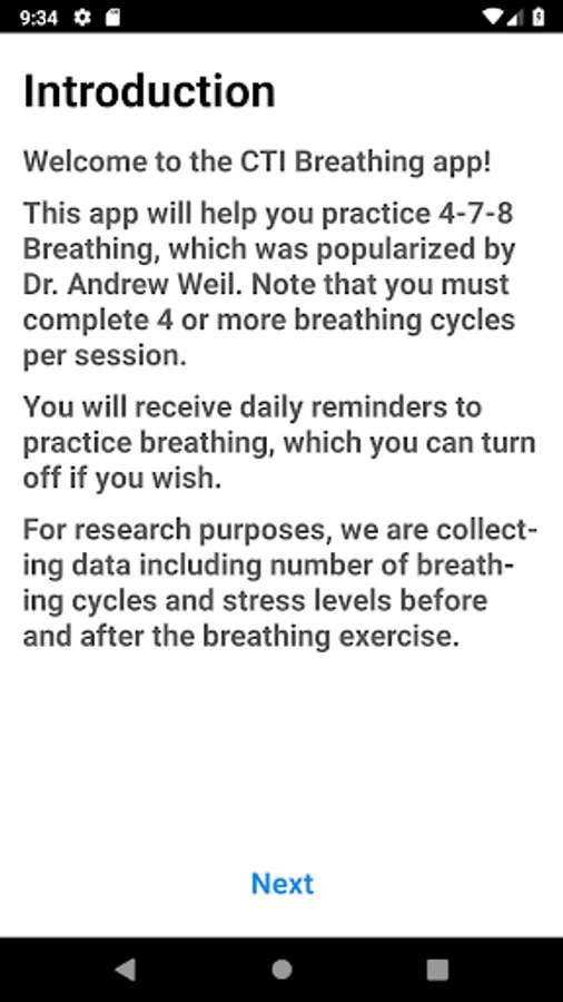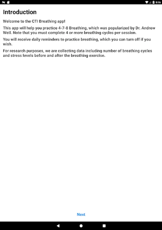 This app was created by university researchers to help users practice the 4-7-8 breathing technique and collect data for research that examines the association between breathing exercise and stress levels. For research purposes, names, time of use, number of breathing cycles, and the stress levels before and after the breathing exercise are collected. We collect no other personal information except for name. Please read the privacy policy for more information.
