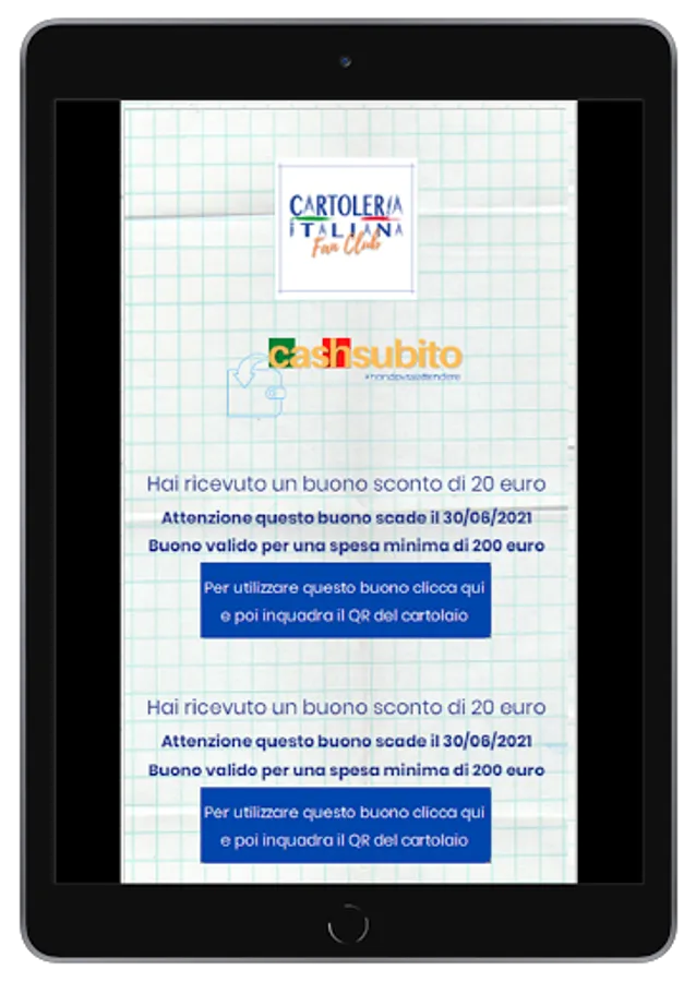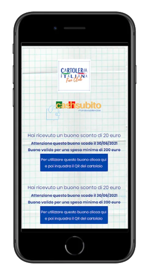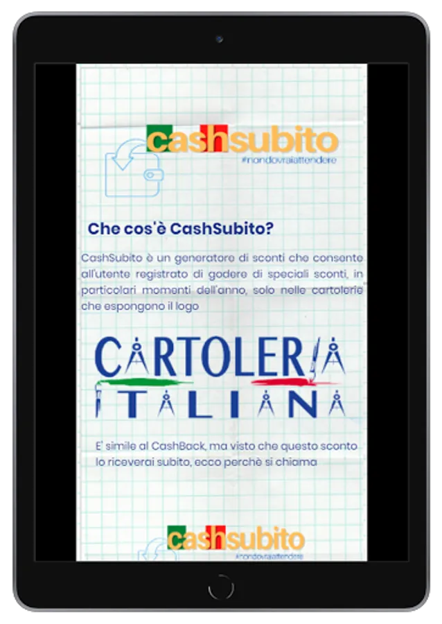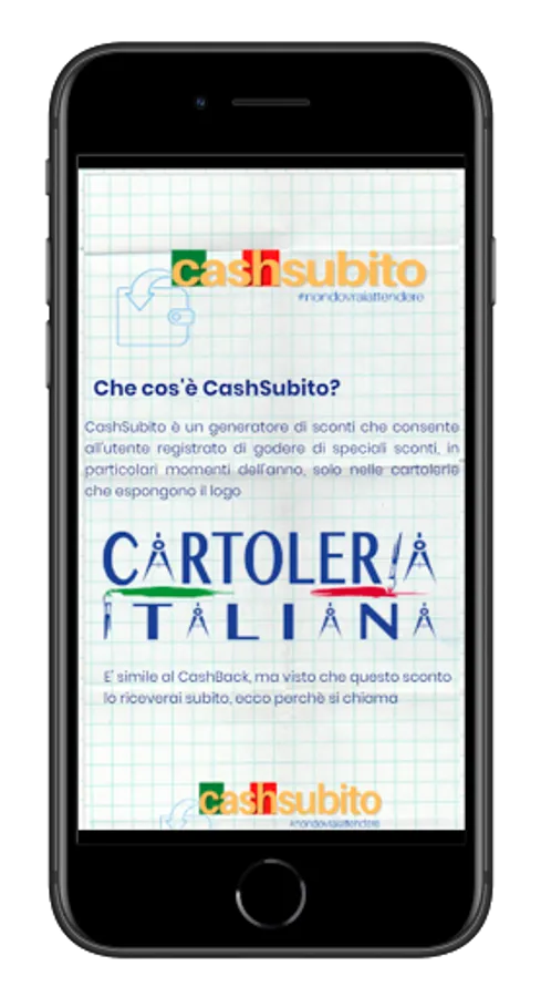 The user who has downloaded the "Cartoleria Italiana Fan Club" app and who resides in the geographical areas where the Cartoleria Italiana group stationeries are located can participate in the CashSubito activity, the list of which can be consulted within the App "Cartoleria Italiana Fan Club “or on the website www.cartoleriaitaliana.it