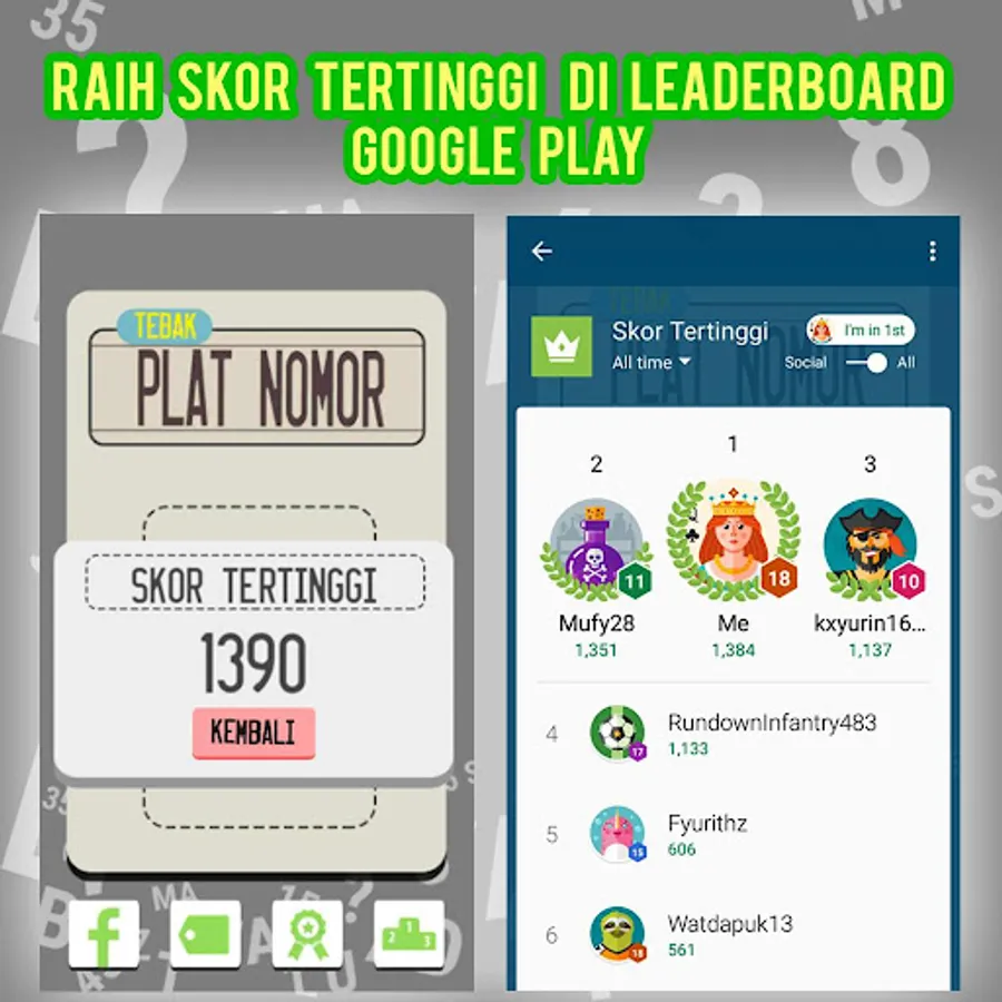 Setiap berhasil tebak plat nomor kamu akan mendapatkan skor dan kamu bisa adu skor tertinggi dengan pemain lain melalui Google Play Leaderboard. Skor dihitung dari waktu yang tersisa, jadi semakin cepat kamu berhasil tebak plat nomor semakin besar skor yang kamu dapat.