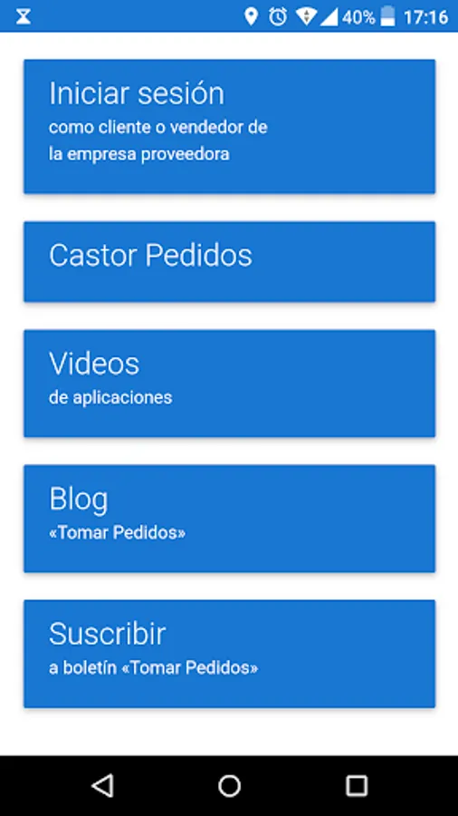 After installation, you can access these applications from the home screen of your device. Keep in mind that cloud applications Castor orders require an active account of the company that will receive orders, which is responsible for enabling users access to their customers and vendors.