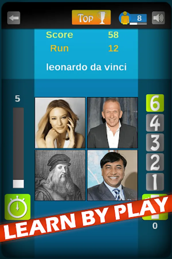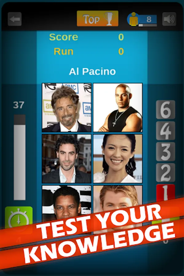 A Name and 2 to 6 Celebrity pictures appear, find the right picture!