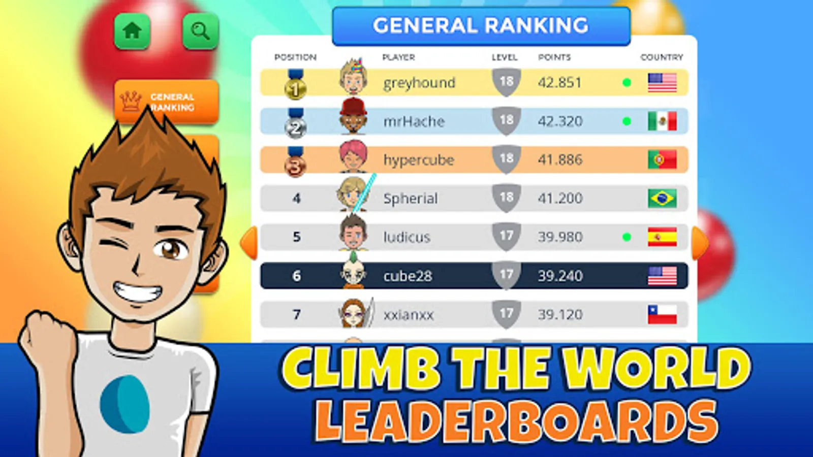 • Rank up positions in the ranking and level up with each match that you play.