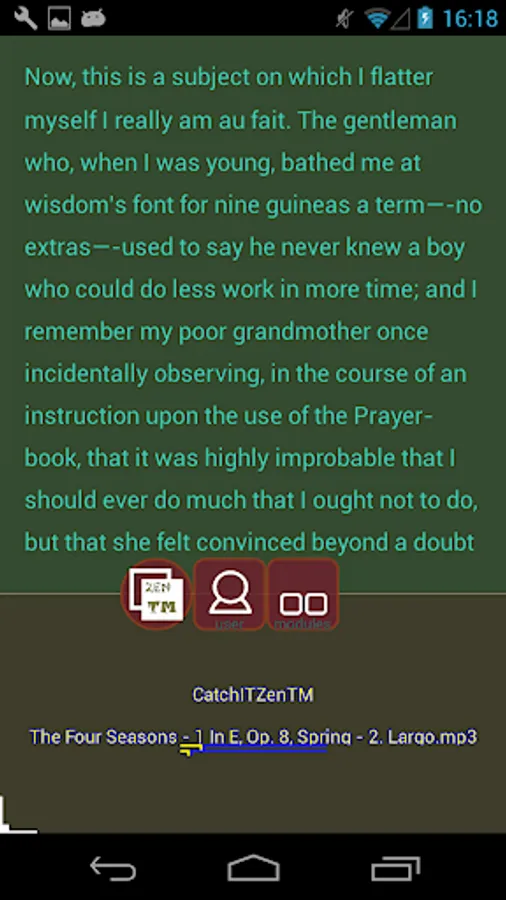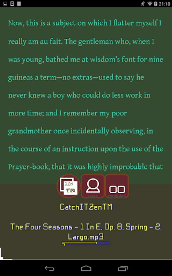 How: 1. Create a directory named “CatchITZenTM” in one of the well-known directories (photos, music, or video) or in the root directory of the SD card; 2. Copy there some text files and some music/audio; 3. The application will load the content when started; 4. If you change the content of CatchITZenTM directory when the application is running, click the widgets' Open button to reload this content.