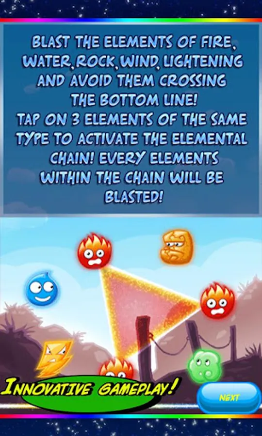 The universe, in its primordial state, needs your help to spread elements in all worlds to bring life to everything. Have fun blasting elements, make elemental chains to maximize the effect, and use shadow and light elemental powers to your advantage to move up the levels to the endless galaxy!