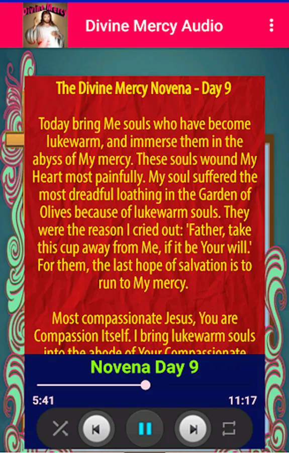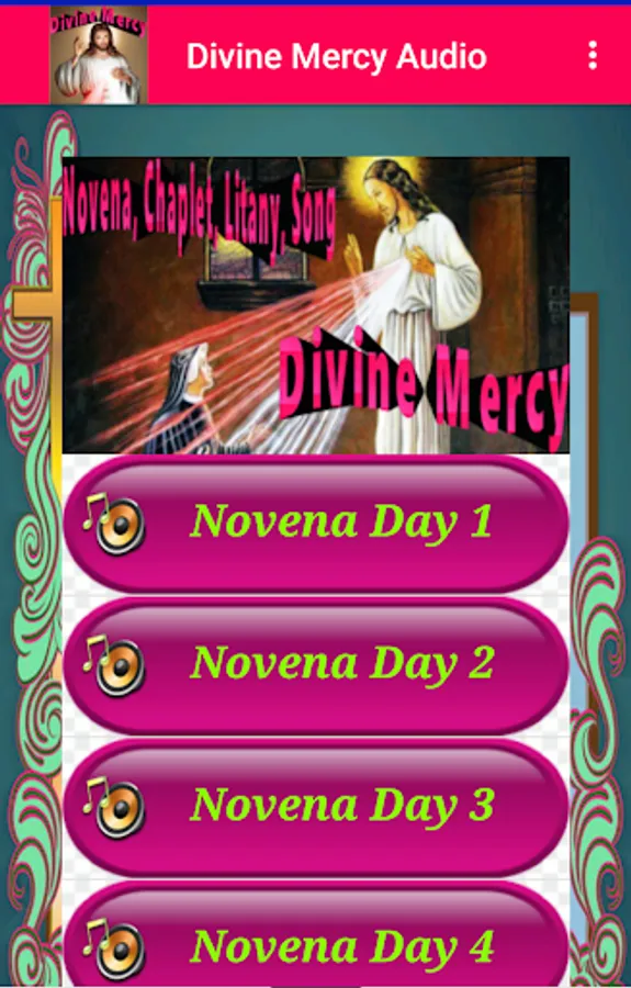 The complete audio collection of Divine Mercy devotion with text as guide for better understanding. It is the most complete St. Faustina Kowalska's Divine Mercy prayer available which include offline audio and guide text of Divine Mercy Novena, Divine Mercy Chaplet, Divine Mercy Litany, and Divine Mercy Song. It can be enjoyed any time and any where in your Android Gadget -- even without internet connection.