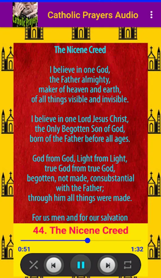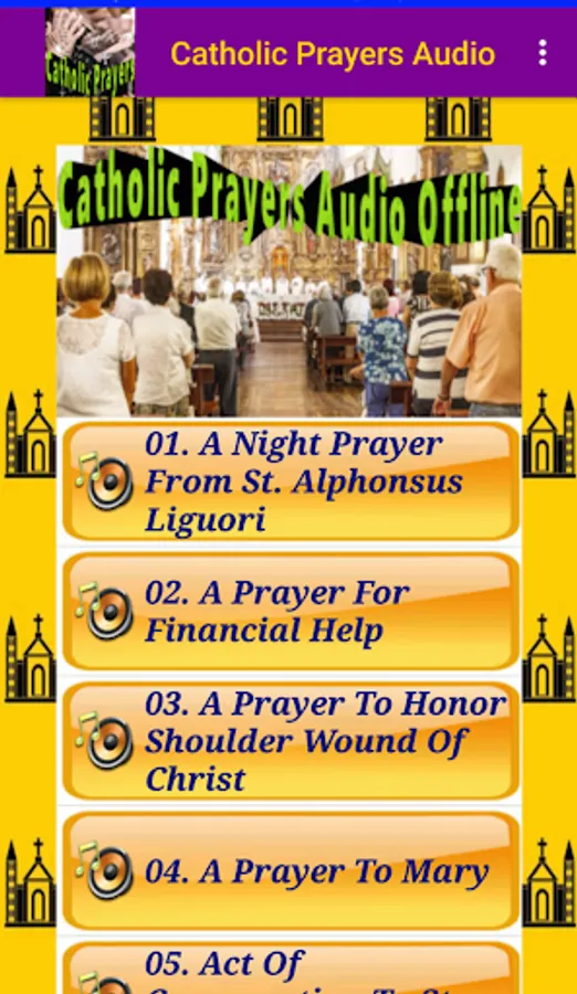An App which consists high quality (HQ) offline audio of the best Catholic Prayers which include Basic Prayer, Common Prayer, Eucharistic Prayer, Mass Prayer, Saint prayer, and more. Install and Enjoy English Catholic Prayers audio such as A Night Prayer From St. Alphonsus Liguori, An Act Of Spiritual Communion, Ave Maris Stella, Prayers To The Sacred Heart Of Jesus, The Prayer To St. Michael, The Veni Creator Prayer, etc. Install and enjoy magic moment of Catholic prayer anytime and anywhere with your android gadget.