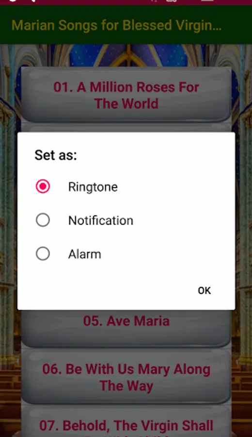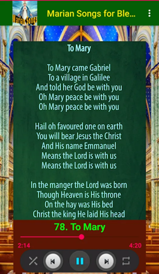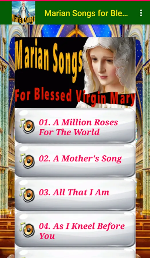 "Marian Songs for Blessed Virgin Mary" offers the best collection of Marian Songs such as Ave Maria, Bring Flowers Of The Rarest, Hail Mary Full Of Grace, Immaculate Mary, Magnificat, Miracle Of The Rosary, etc. Please install the app and enjoy the best of Praise and Worship Songs focused on Mary, Mother of Jesus Christ. Enjoy Marian Hymns in high quality (HQ) offline audio with lyric, ringtone, and Play All feature.