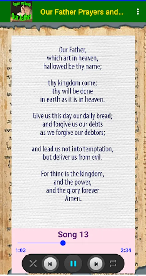 In addition to the prayers, the app also provides a selection of "Our Father" songs with lyrics. Sing along to these uplifting melodies and let the music elevate your prayerful experience. Feel the deep connection to your faith as you engage in the harmonious rhythms of these sacred songs.