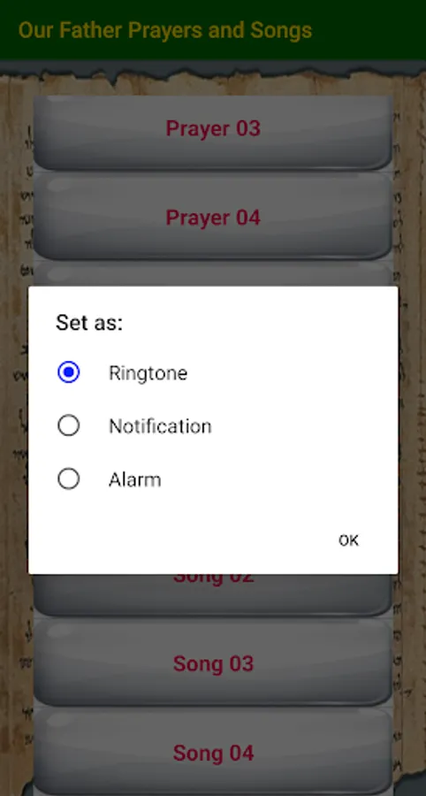 To personalize your experience, the app also includes a ringtone feature. Choose your favorite "Our Father" song or prayer and set it as your ringtone, allowing the sacred melodies to accompany you throughout your day. Every time your phone rings, you will be reminded of the beauty and significance of the "Our Father" prayer.