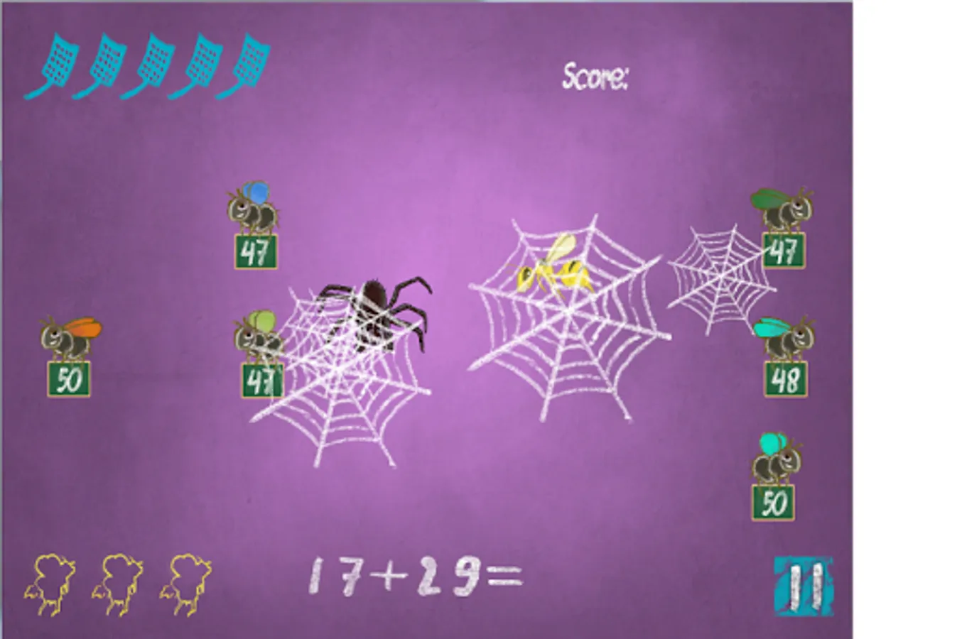 Math Swatter is a fun, educational game based around tapping the fly that holds the correct answer to the given equation. Players are given a set amount of lives, one of which is taken away upon the selection of an incorrect answer. Game obstacles include hornets and spiders, both of which appear as the game progresses.