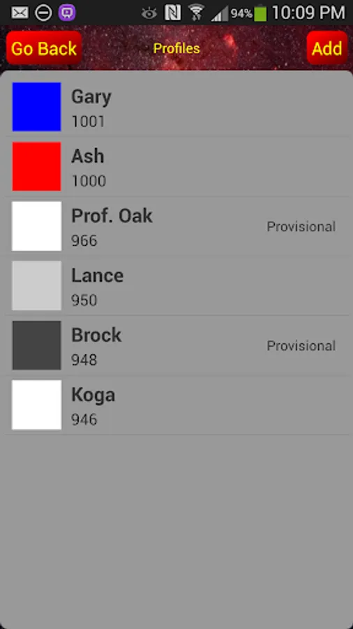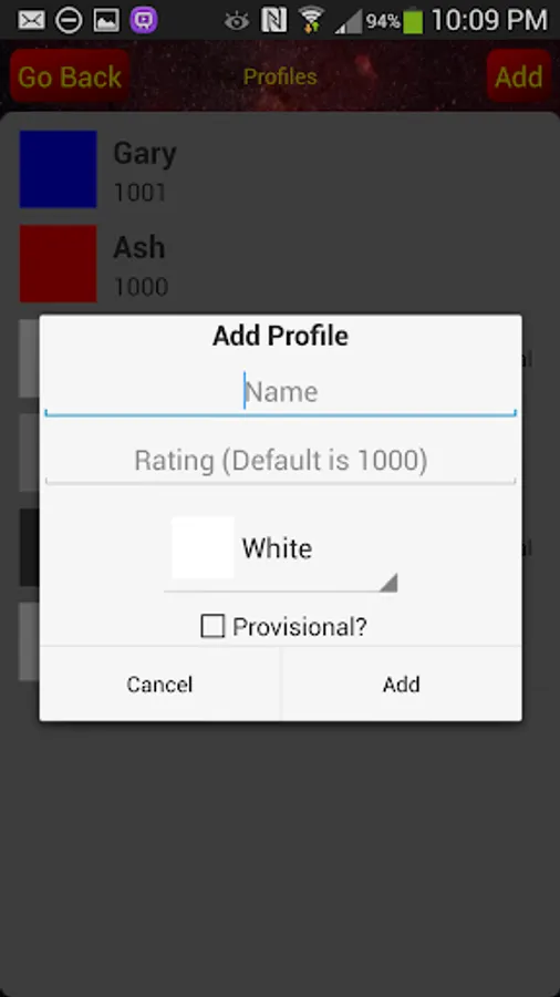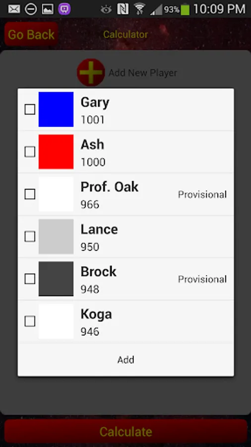 Create player profiles on the "Profiles" screen, with each player starting with a rating of 1000. After you play your game, add the participants on the "Calculator" screen and select the winner. The app will automatically calculate the new ratings and update and re-rank the player profiles with the new ratings. Use this app for any competitive game--Settlers of Catan, Super Smash Bros., Halo, Risk, Monopoly, Chess, Checkers, etc.