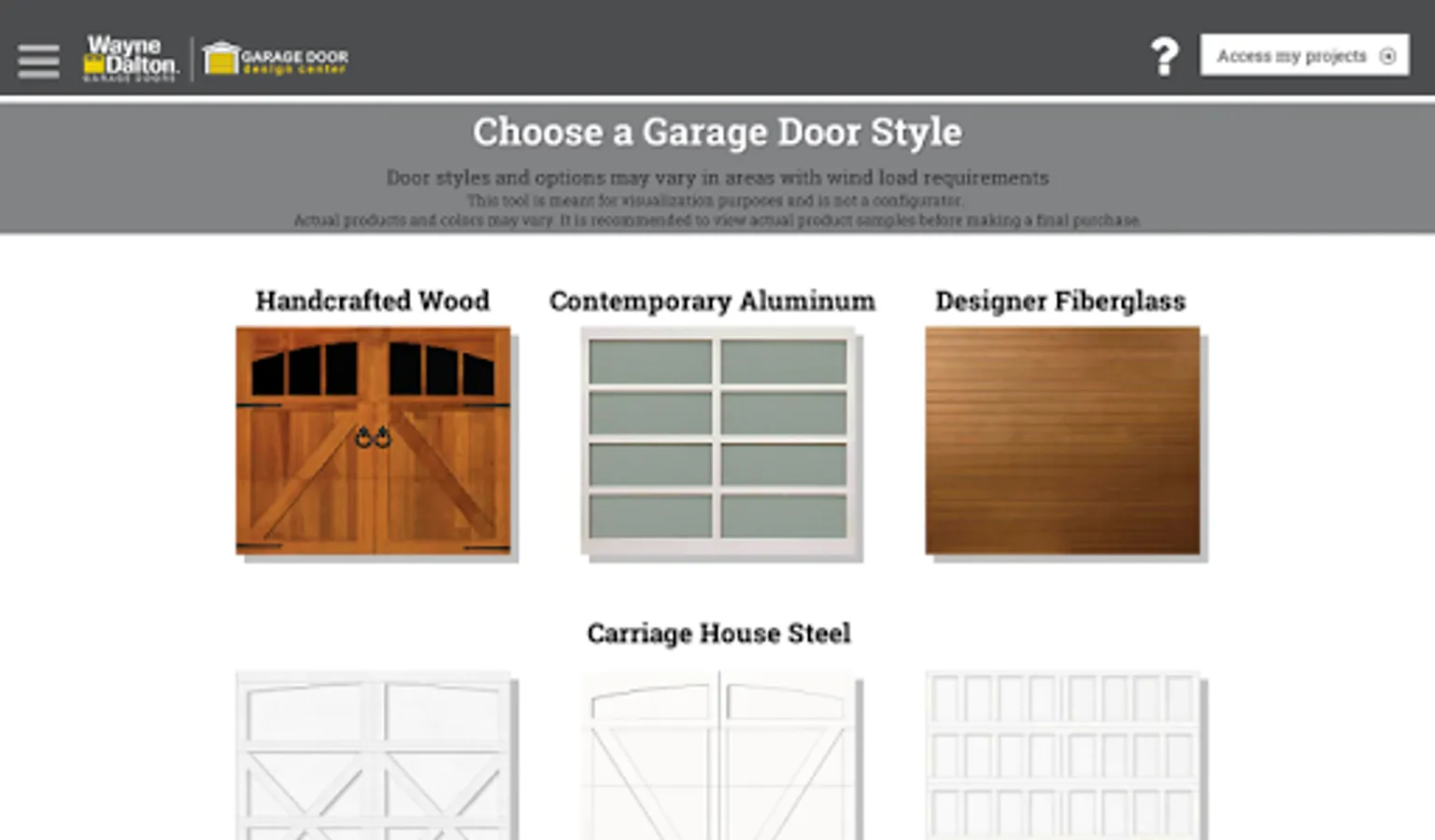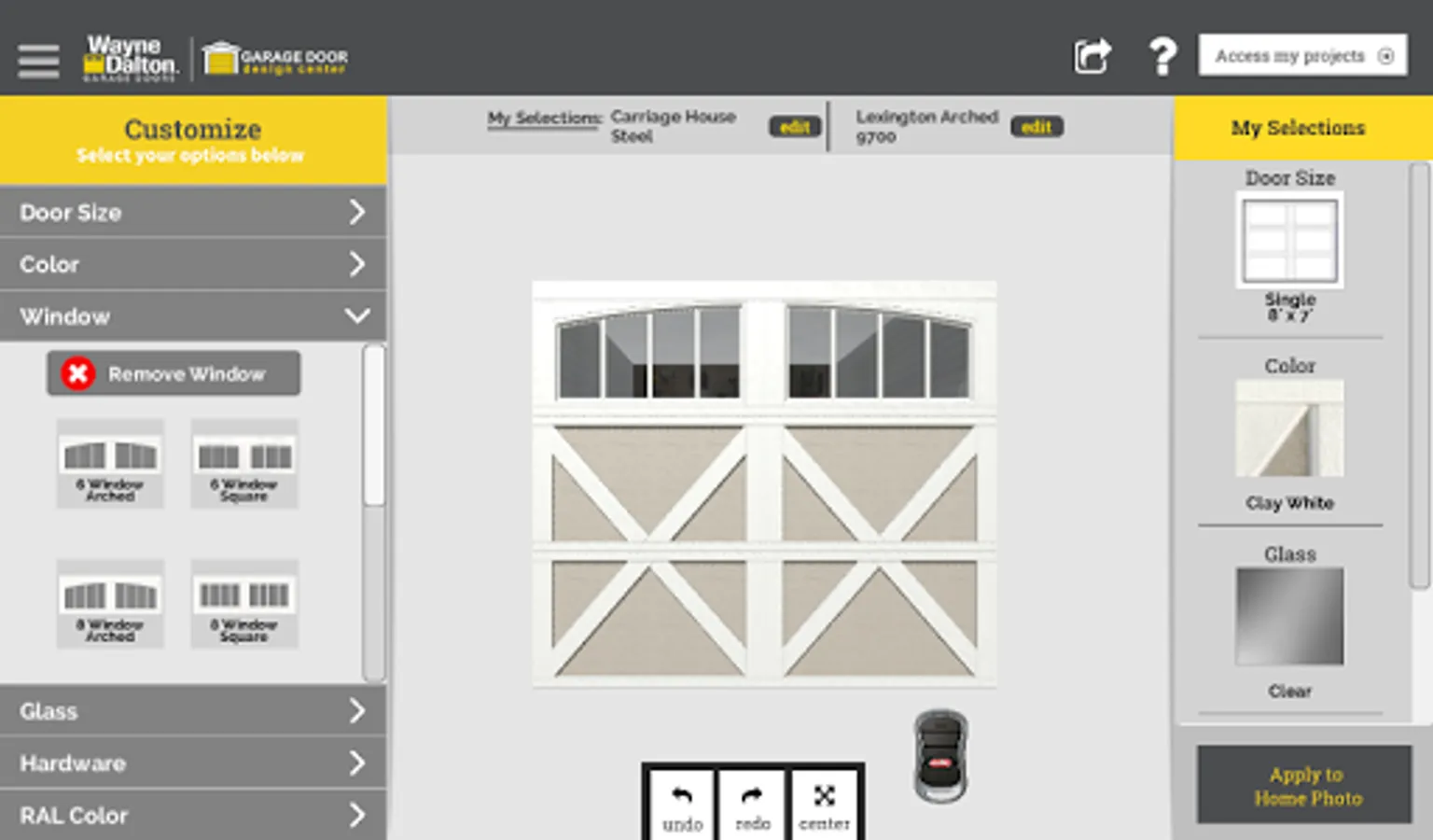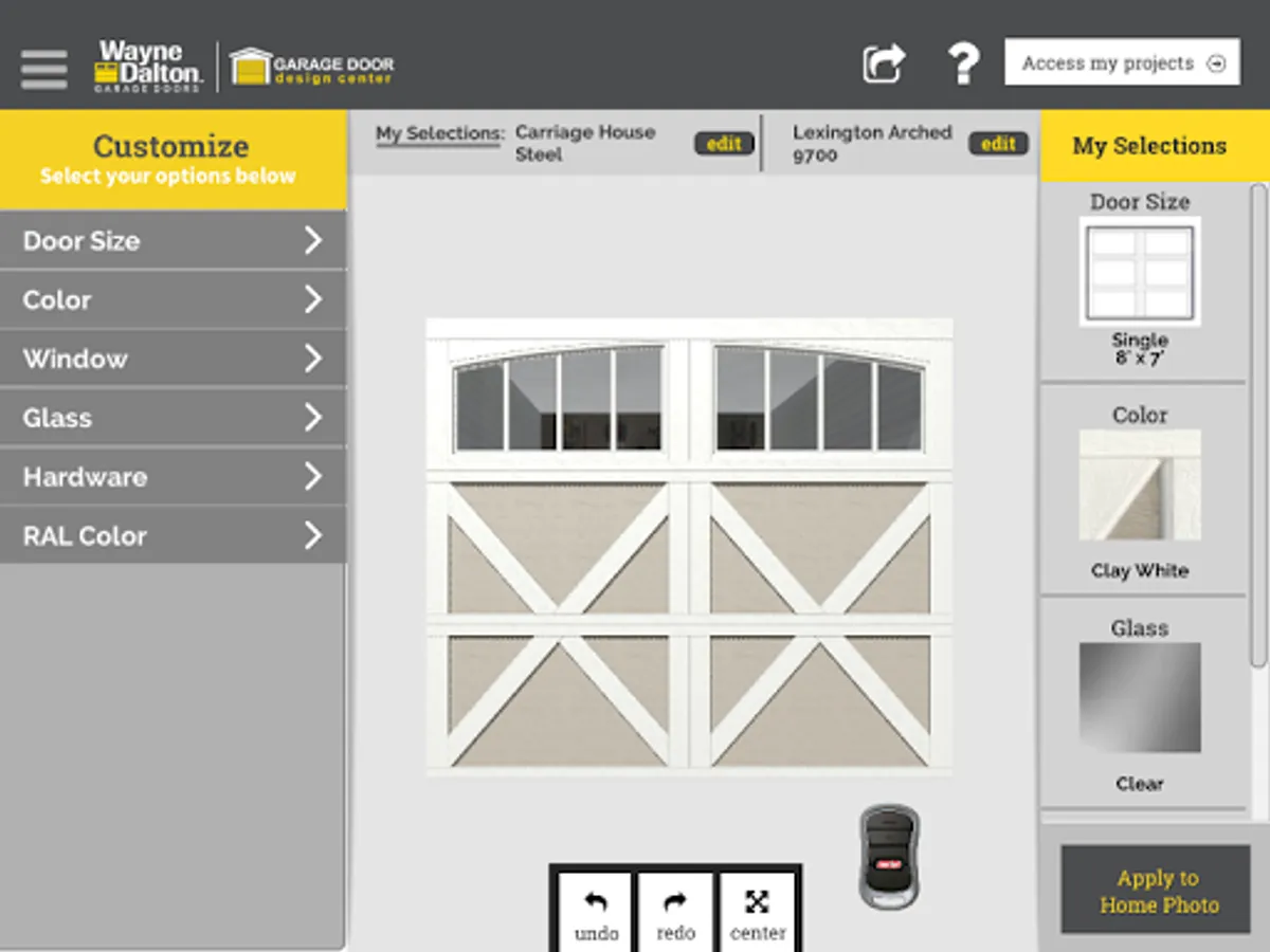 Make your garage door uniquely yours with the Wayne Dalton Design Center. Experiment with panel designs, color options, window styles and decorative hardware designs and place your custom-designed door onto a photo of your house. Instant curb appeal awaits with just a tap of the screen!