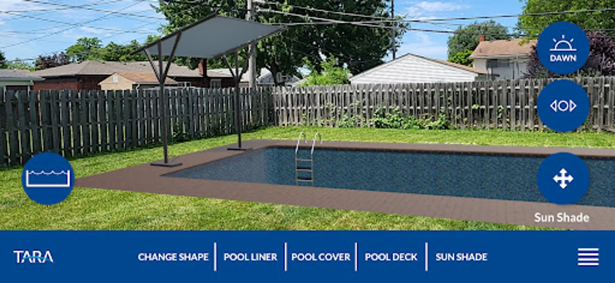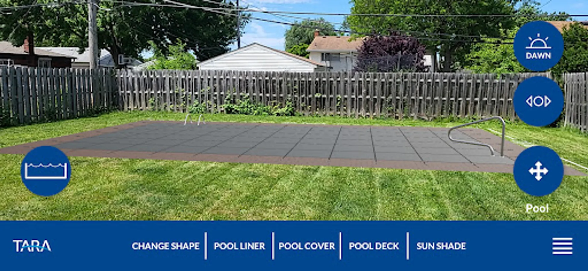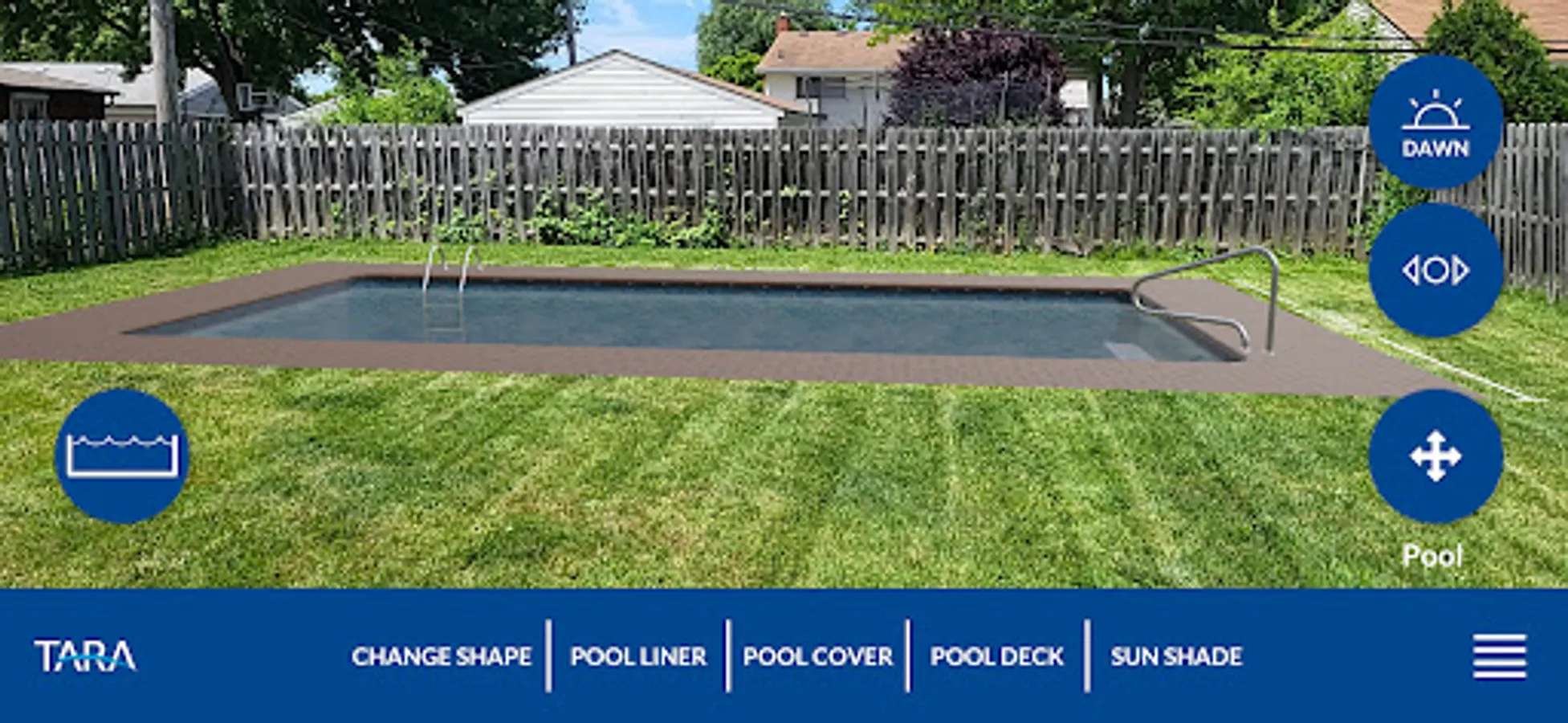 The Envision AR app from Tara brings the power of augmented reality to your pool design process. Using your camera, the app allows you to place a pool in your backyard, giving you a sense of the size and area, you will need. Select a pool shape and then position it in your yard. Move it and rotate it to find the best location. Browse our entire pattern collection filled with the most incredible selection of styles, colors and designs. Choose any pattern and see how it will match the colors of your backyard. Envision AR shows you how the pool liner looks in water or remove the water with a touch of a button. You can spin the pool around to see it from every angle and change the time of day to experience different lighting conditions.