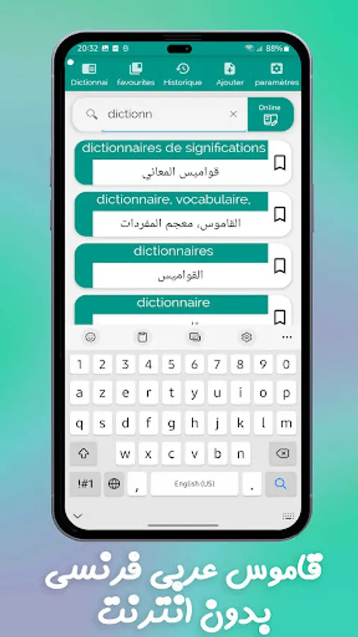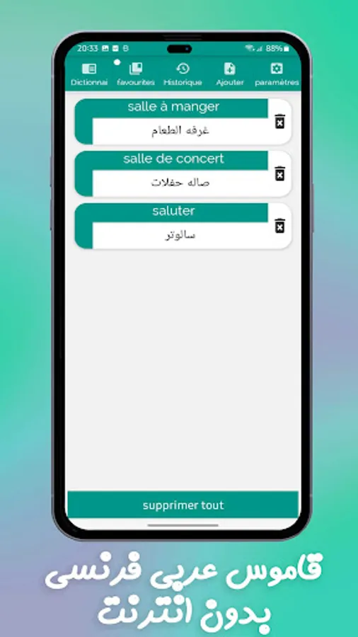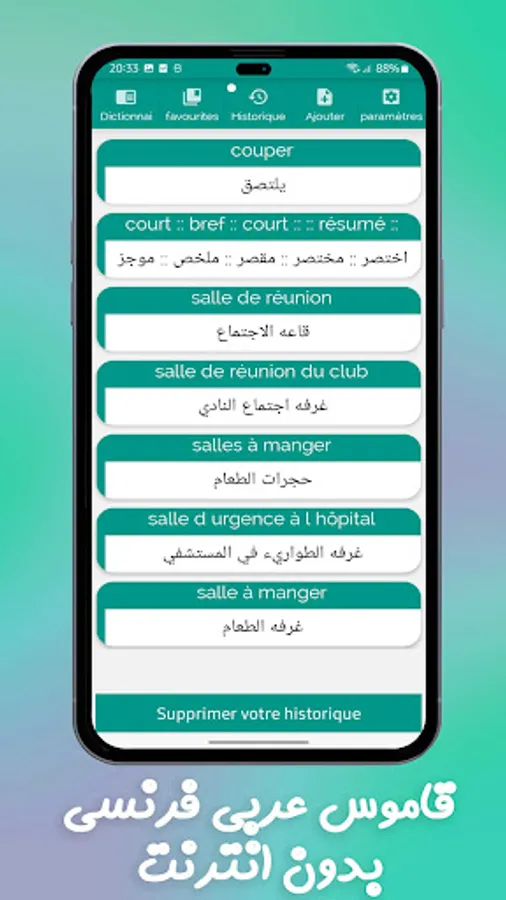 Dictionary French - Arabic and Arabic - French simple, fast and convenient contains thousands of words and phrases .. The dictionary is offline. The dictionary contains the vocabulary trainer. It's an easy way to learn new words.