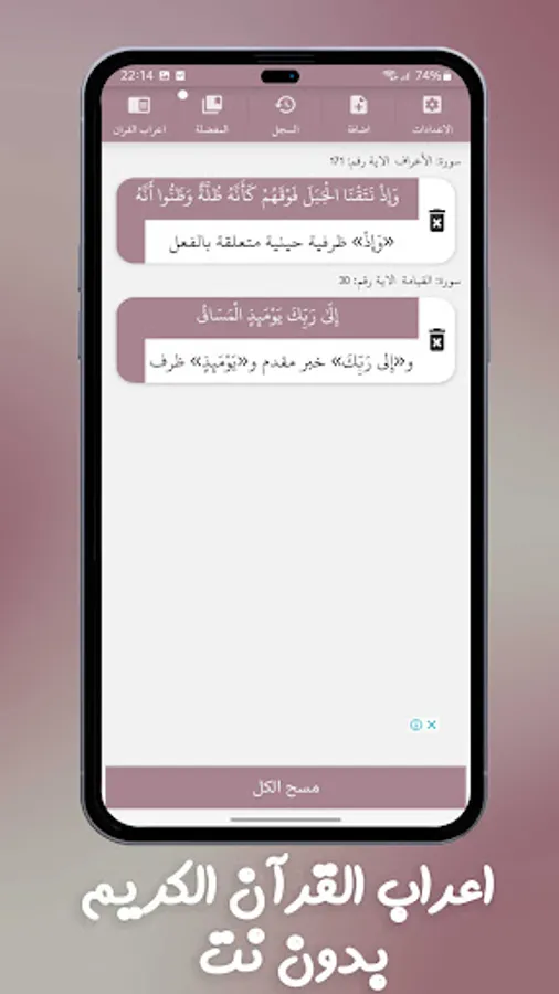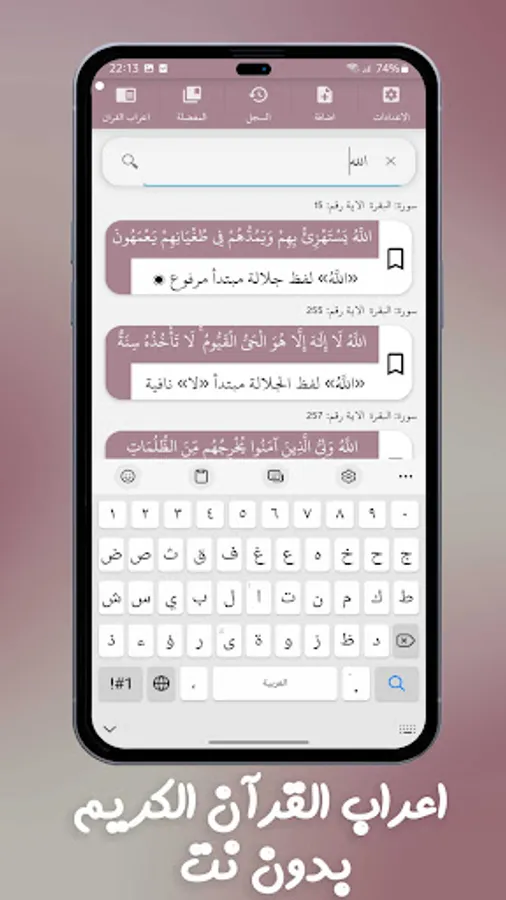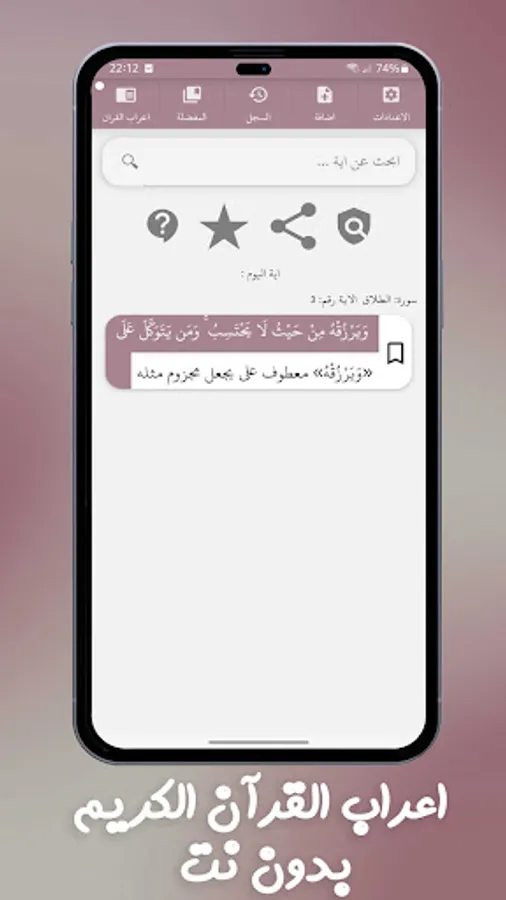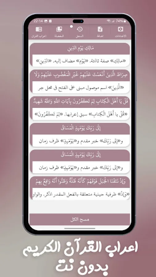The syntax of the Holy Qur’an is complete without the Internet, and it includes an index of the chapters and an index of the verses of the selected surah, and the ability to search the Holy Qur’an with the ability to write a note on the syntax of a particular verse, and the ability to place multiple marks on the verses, and the ability to share the text of the verse with its syntax via Facebook, WhatsApp, etc., and a list of all written notes and a list of all Signed verses