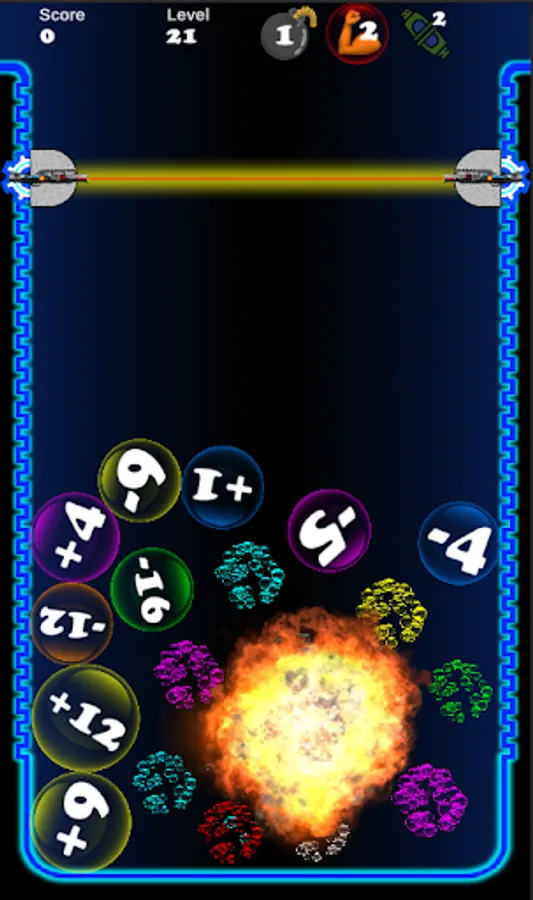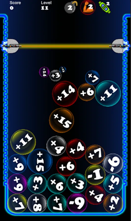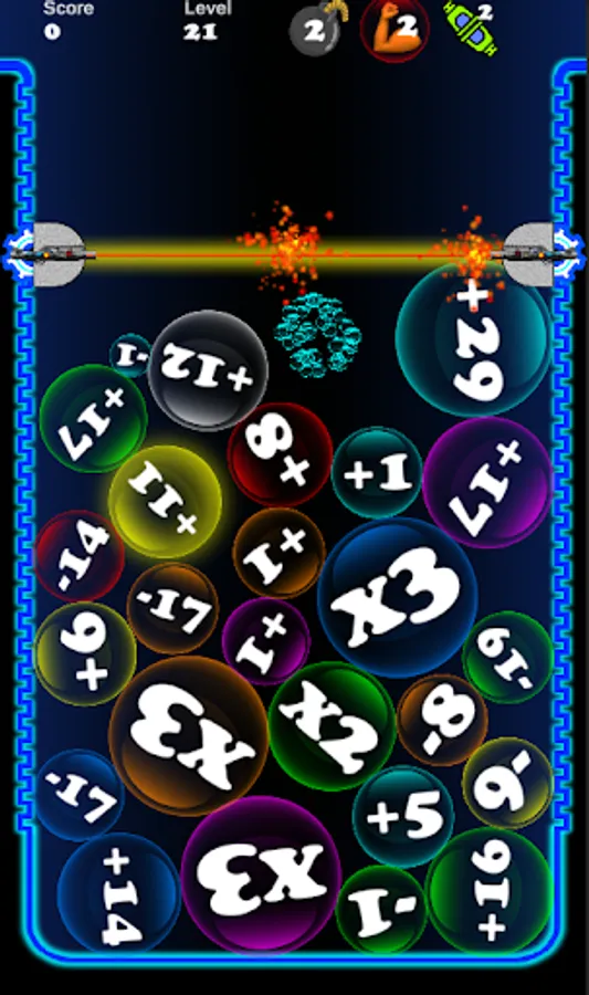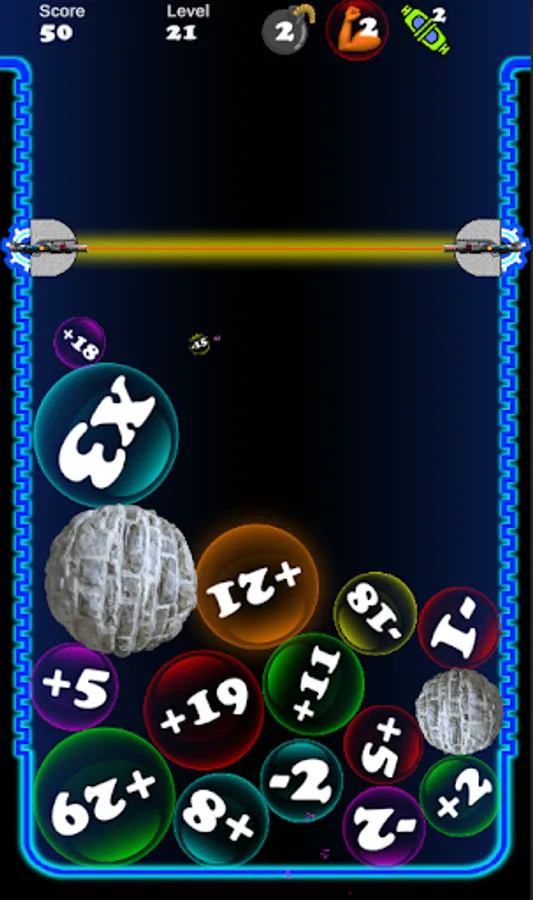 Two laser guns will descend from the top. Once the laser beam touches any bubble below, you lose. Fortunately, popping bubbles with multiples of 10 will send out ripple energy to adjacent bubbles to burst them, as well as power sparks to the guns, raising them up.