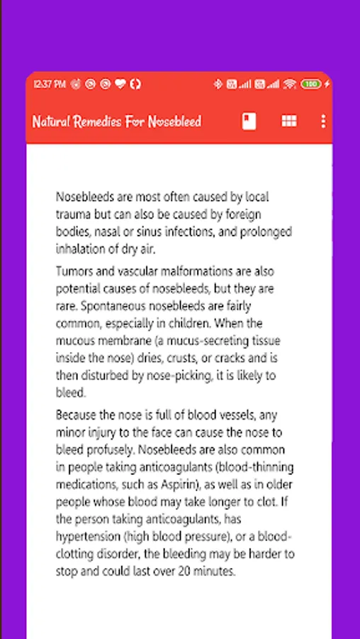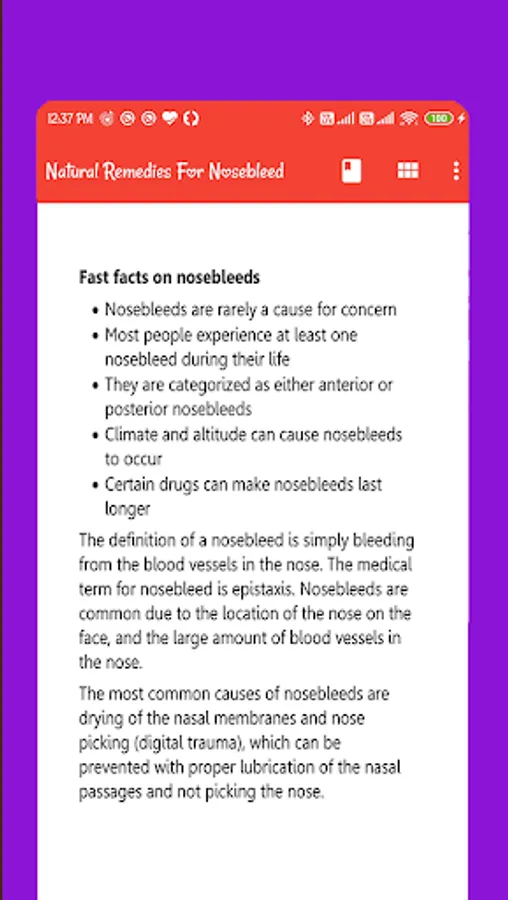 Nosebleeds ("epistaxis" in medical terms), occur in 1 out of 7 people. With the exception of a rare, underlying clotting disorder or tumor, the vast majority of cases are benign in nature and will resolve spontaneously generally within 5 to 20 minutes. This article examines the common causes, treatment and prevention of nose bleeds.
