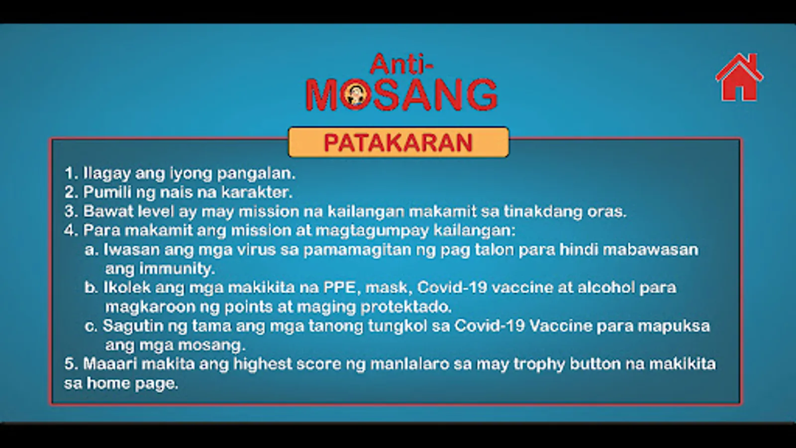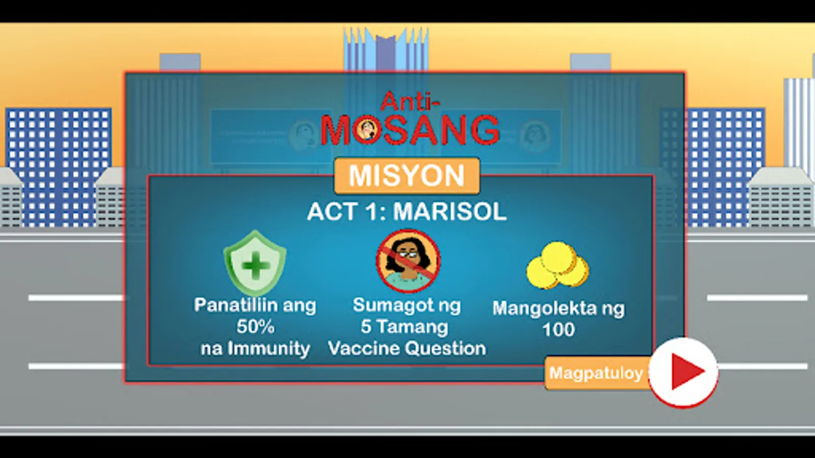Anti-Mosang Labanan ang Haka-Haka sa COVID-19 Vaccine is a digital game application and design project aimed at educating and improving Filipino Generation Z awareness about the COVID-19 Vaccine Facts.