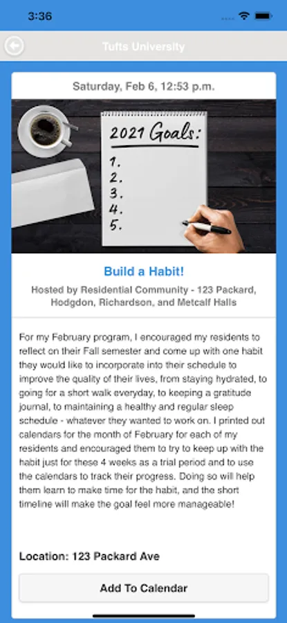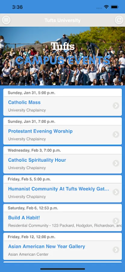 Use the Tufts University Events app to find out what events are happening and find out how you can get involved on campus!