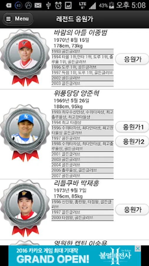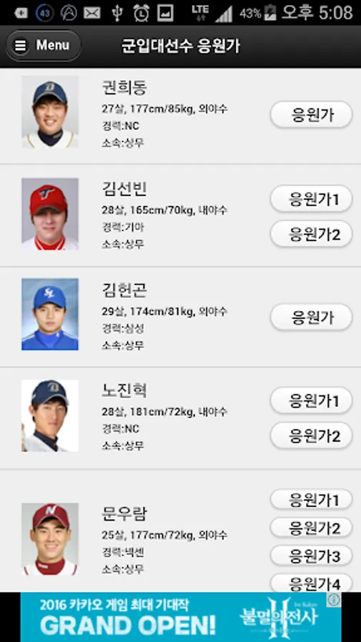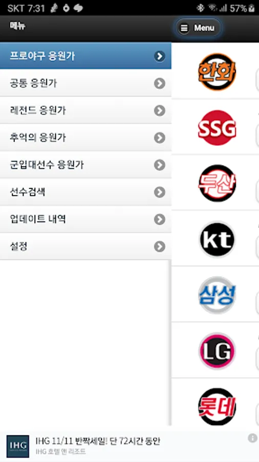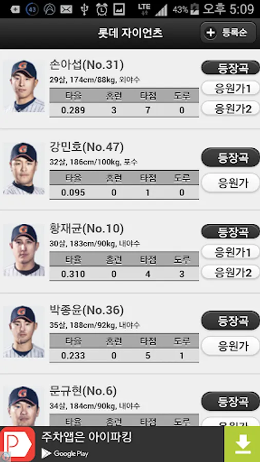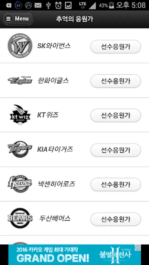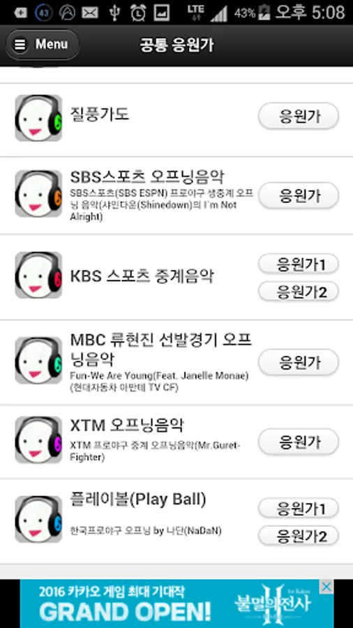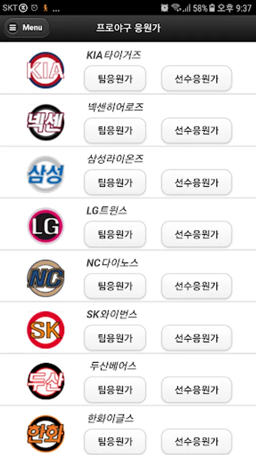 The pro baseball cheering songs include team cheering songs, player cheering songs, and player appearance songs from 10 teams (Doosan Bears, LG Twins, Lotte Giants, KIA Tigers, Samsung Lions, SSG Landers, Hanwha Eagles, Kiwoom Heroes, NC Dinos, kt wiz). It is included, and you can hear common cheering songs, legend cheering songs, memories cheering songs, and military enlisted players cheering songs. You can easily find a cheering song by searching for a player, and you can easily learn a cheering song by repeating the sound source in Settings.