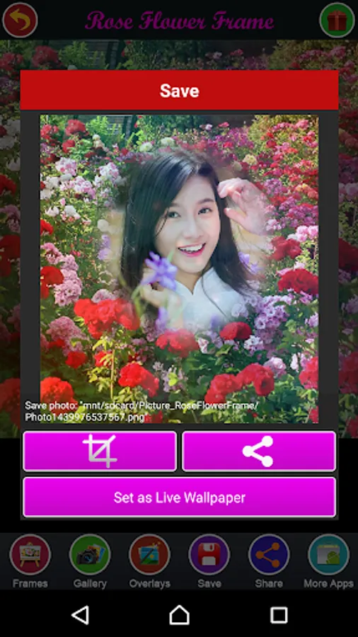 - Auto save photos to sdcard/Picture_RoseFlowerFrame/ and show them in gallery