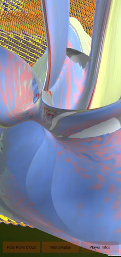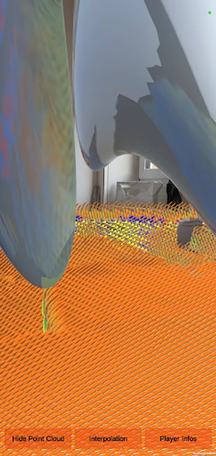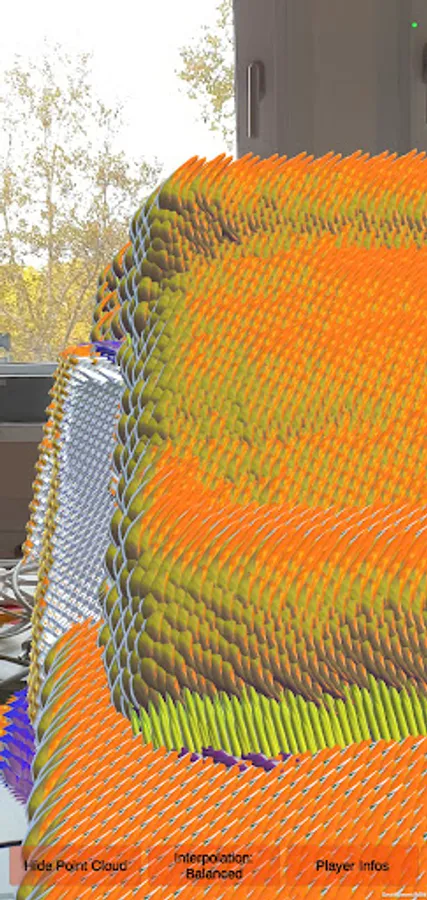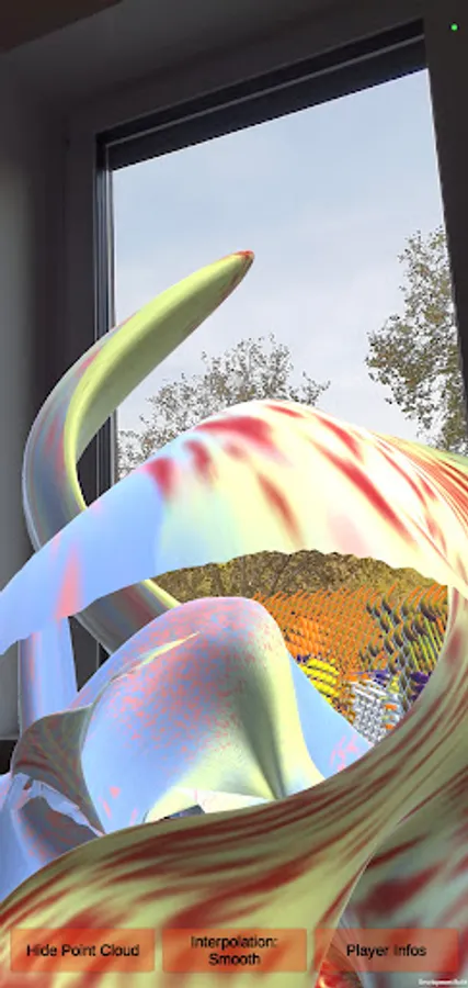 Button: Show Point Clouds to generate AI nano-sculptures all over the real place. Button: Interpolation to interpole sculptures with a certain shape. Tap the screen to generate random physics phrases wherever.