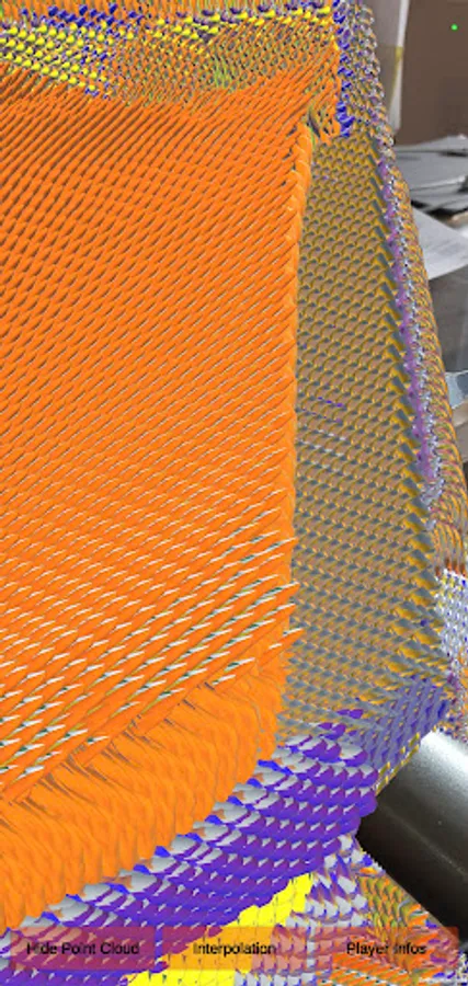 Depth Data Space is an augmented reality application using pre-trained AI algorithms that interpret real space to design a structure made of points cloud surrounding the tangible situ. Through AI the real-time depth buffer turns into nano-sculptures that, seen all together, design a Big Data Space always different according to the real piece/space that it will cover. Players are invited to look at the digital evolution of the surface, exploring the liminal duality between tangible and virtual place across unpredictable synesthetic combinations.