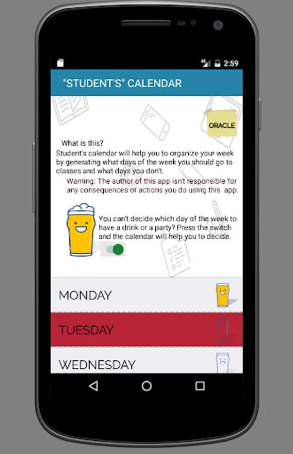 College student's calendar will help you to "organise" your week by generating what days of the week you should go to classes and what days you should not. If you can't decide which day of the week to have a drink or a party? The college student calendar will help you to decide. Should you go the the class tomorrow? Will you pass the test or the exam? Will my grades be better? All these questions can be answered by the Oracle in this student's calendar.