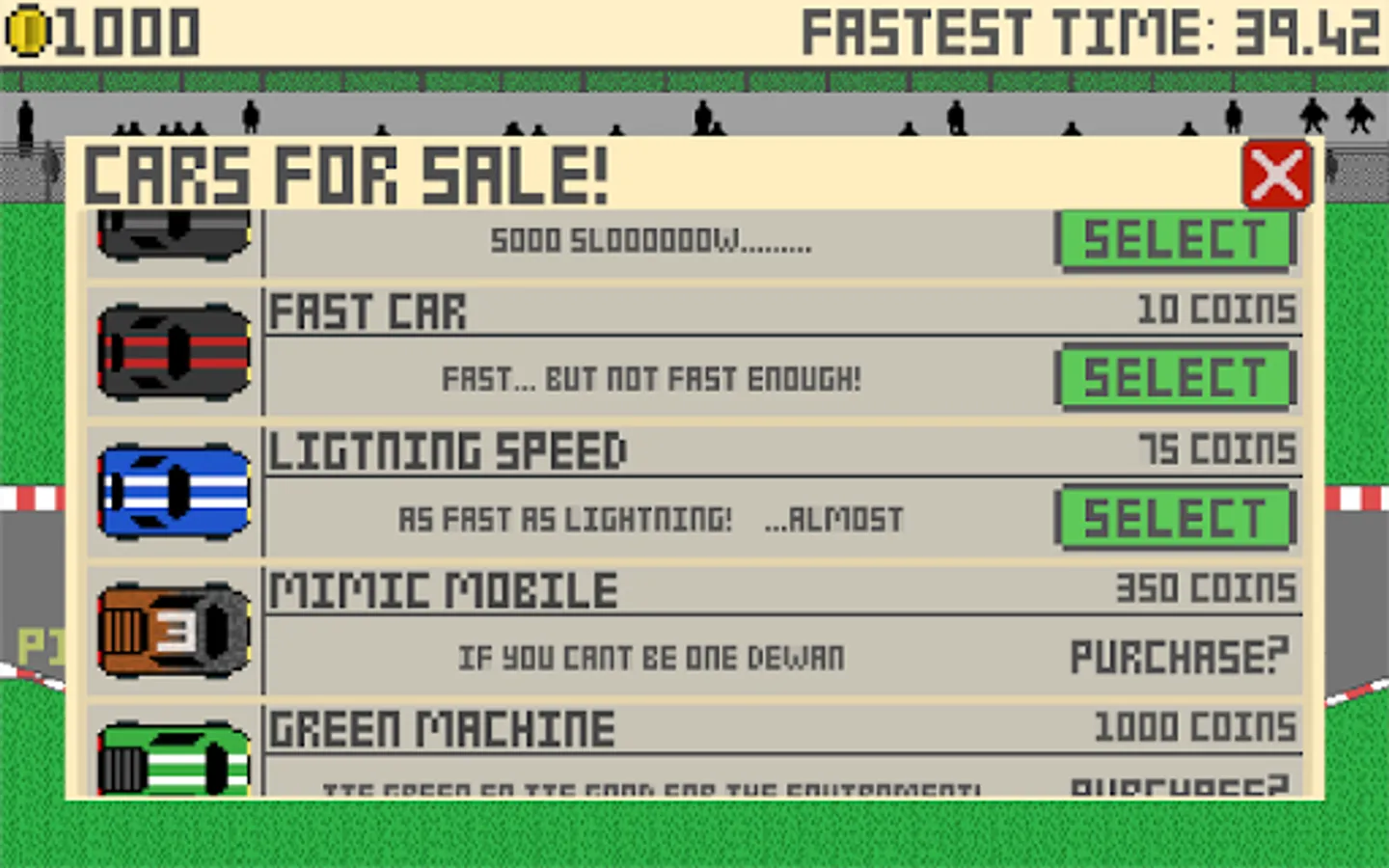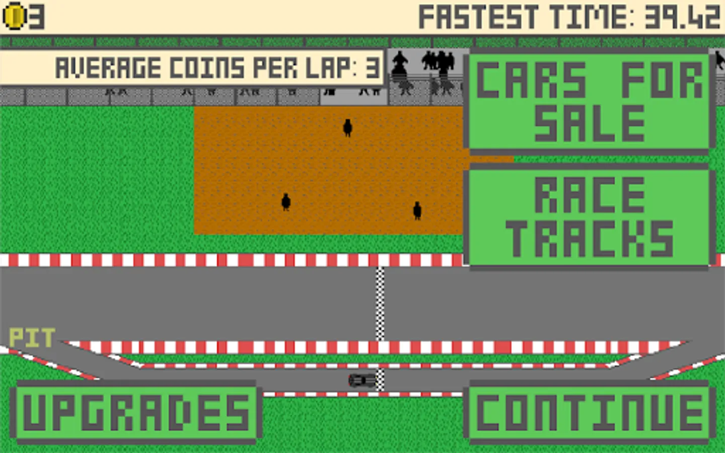 Race around the track to earn coins, build up a following of fans to earn more. Buy new cars and upgrades to get around the track faster!