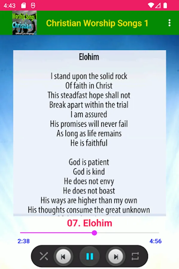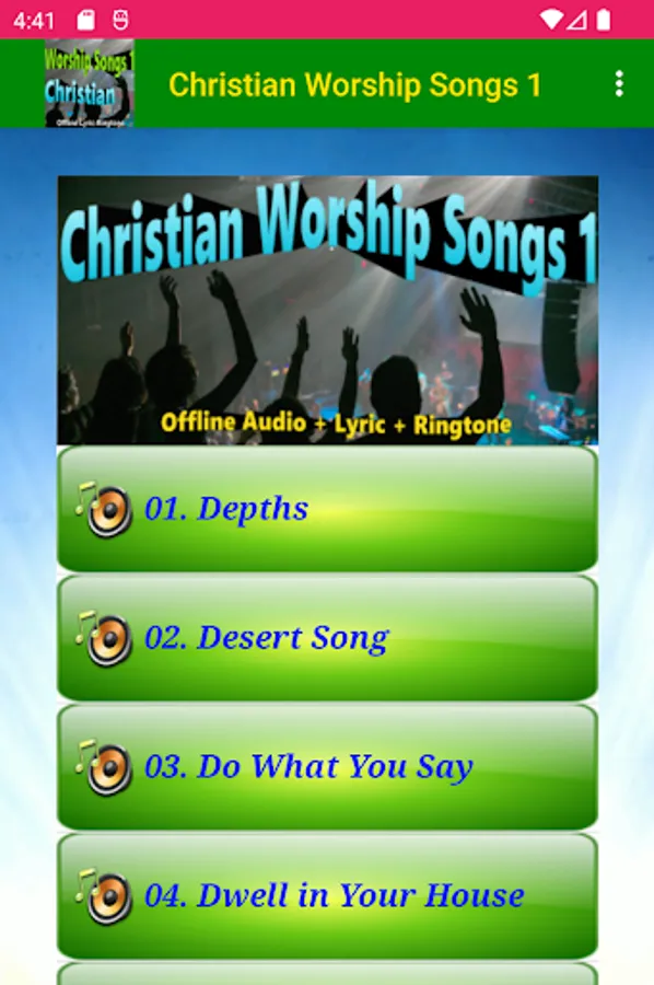 Christian Praise and Worship Songs 1 consists of Hillsong praise and worship songs. Enjoy Best Christian Praise and Worship Songs for Christian soul. Install and enjoy the great compilation of Hillsong Christian Songs. All Christian Church Songs can be enjoyed without Internet connection. Song lyric is included so it is easy to understand each song and sing along. Let's praise and worship the Almighty God and hope for His grace touch our soul.