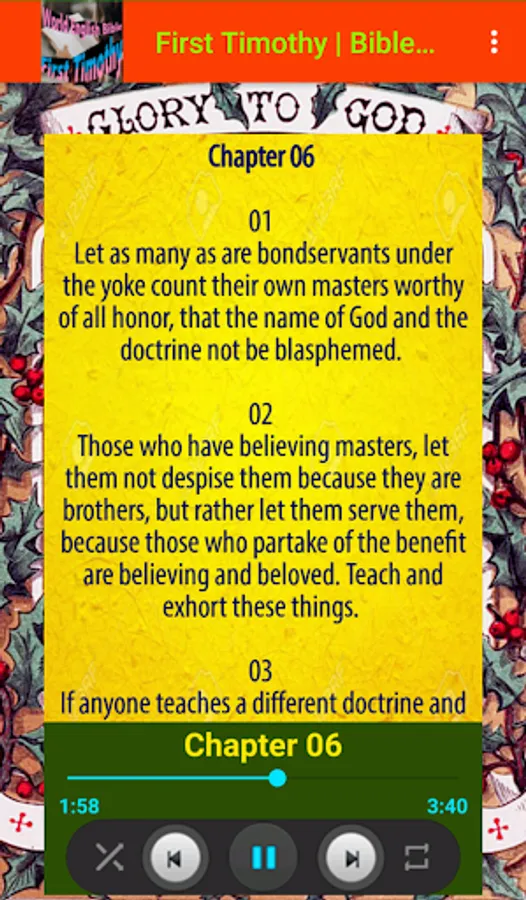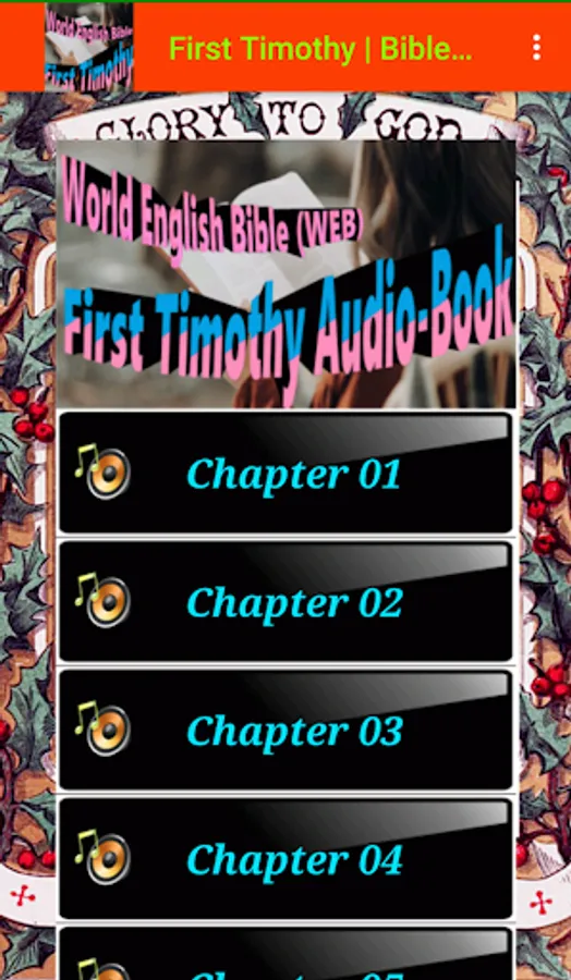An app for anyone who want to know about Christianity directly from the source (Bible). Enjoy Complete chapter of First Timothy (The first Epistle to the Timothy) in good quality audio with transcript (text). Enjoy the beauty of God's word anytime and everywhere -- even without internet connection (offline) -- via your Android gadget. This app presents you the complete chapter of First Timothy based on World English Bible (WEB). You can enjoy it all in quick, simple, and easy way. A must for devoted Christian soul.