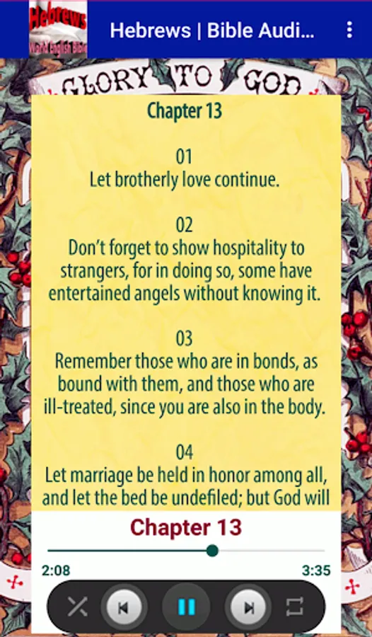 An app for anyone who want to know about Christianity directly from the source (Bible). Enjoy Complete chapter of Hebrews (The Epistle to the Hebrews) in good quality audio with transcript (text). Enjoy the beauty of God's word anytime and everywhere -- even without internet connection (offline) -- via your Android gadget. This app presents you the complete chapter of Hebrews based on World English Bible (WEB). You can enjoy it all in quick, simple, and easy way. A must for devoted Christian soul.
