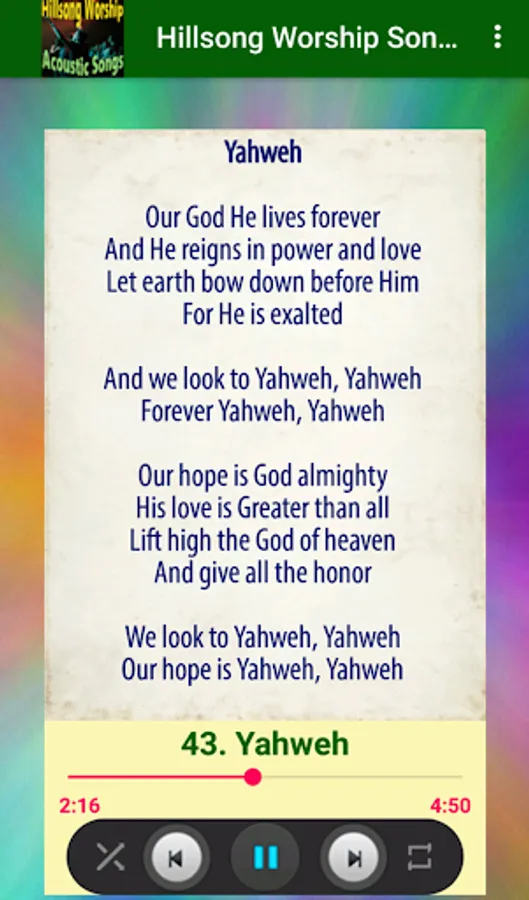 Hillsong Worship Songs Acoustic offers the best collection of popular Hillsong Praise & Worship Songs with beautiful Acoustic Music. Install and enjoy popular Gospel Songs with Acoustic music such as Elohim, God Is Able, King Of Kings, Oceans (Where Feet May Fail), Touch Of Heaven, Yahweh, etc. Enjoy the best of contemporer acoustic Christian Songs in high quality offline audio with Lyric, ringtone and play all feature.