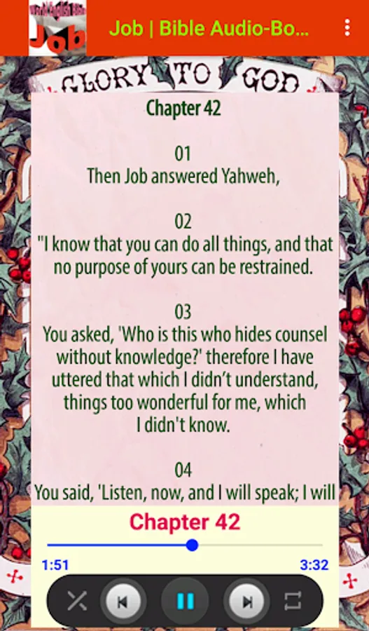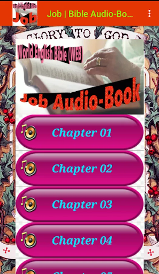 An app for everyone who want to know about Christianity directly from the source (Bible). Enjoy the complete chapter of Job (The Book of Job) in good quality audio with transcript (text). Enjoy the beauty of God's word anytime and everywhere -- even without internet connection (offline) -- via your Android gadget. This app presents you the complete chapter of Job based on World English Bible (WEB). You can enjoy it all in quick, simple, and easy way. A must for devoted Christian soul.